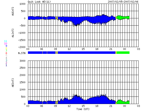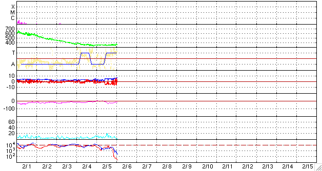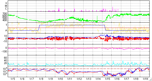 ACEが観測した太陽風の磁場(1番上の枠、白線は全体の強度、赤線は南北成分) および、太陽風の密度(3番目の橙線)、速度(4番目の黄線) (c) NOAA/SEC ![]() リアルタイムAE指数 下段のAEグラフの値が高くなると、オーロラ活動が活発化しています。 (c) 京都大学, NICT ![]() 沖縄の磁場擾乱 下へ下がるほど、擾乱が発達している事を意味します。 (c) NICT ![]() 27日の太陽周期に合わせたデータプロット 太陽が同じ面を地球に向けていた27日前の変化から、今後を予想することができます。 (c) NICT