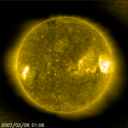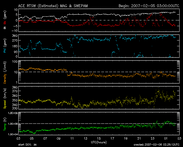 2007/ 2/ 6 11:27 更新 太陽風の磁場強度が回復しています。長時間の南向きの影響で、磁気圏がやや活動的になりました。 担当 篠原 太陽風の磁場強度が5〜6nTに回復し、 -5nT程度の南向きが続くなどの特徴的な変化をしています。 速度としては低速のままで、350km/秒で安定しています。 ACEの図では、-5nTの南向き磁場が半日にわたって続いています。 その影響が磁気圏にも及んでいます。 AE指数を見ると、500nT規模の中規模の変動が長時間にわたって続いています。 これは、太陽風磁場が安定して南を向いたために、 磁気圏内部に安定してエネルギーが流れ込んでいたことを示しています。 ただし、速度が遅かったので、 エネルギーの量としてはそれほど大きなものではありません。 同様に、沖縄の磁場データを見ると、昨日(右側3分の1)の変化の中央部分に、 弱いへこみが見えています。 この磁場の減少が、AE指数の変化に対応する変化です (沖縄の減少と、AEの増加の発生時刻が一致しています)。 大変弱い規模ですが、磁気嵐と同じ現象が発生していたのです。 27日周期の図を見ると、前周期の1月9-10日に類似した変化が発生しています。 従って、前周期の太陽風変化がそのまま回帰している可能性があります。 今日もこのまま磁場がやや強まった状態が続き、 それに続いて明日から速度の小さな上昇が見られるかもしれません。 放射線帯の高エネルギー電子は、磁気圏の乱れの影響で、 一気に数が減少しています。 今後は、このまま低レベル状態が続くでしょう。 また、太陽のフレア活動はたいへん穏やかです。 X線のグラフには変化がなく、レベルも最低レベルに達しつつあります。 黒点群は2つ見えていますが、940黒点群は周囲の小さな黒点も減ってしまい、 勢力が弱まっている様です。 SOHO衛星のEIT284カメラの映像 (c) SOHO (ESA & NASA)