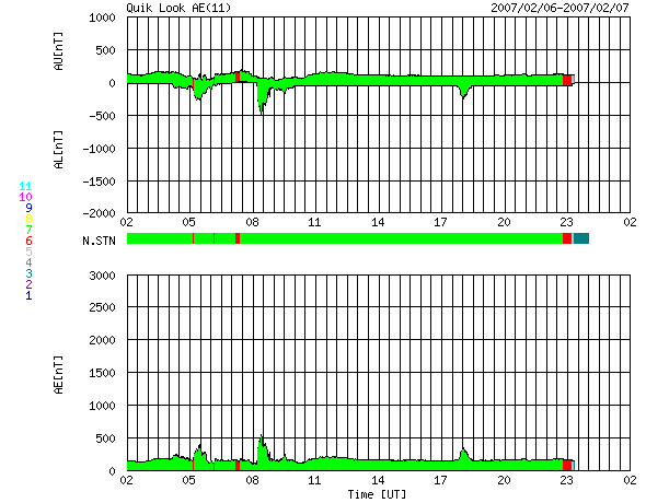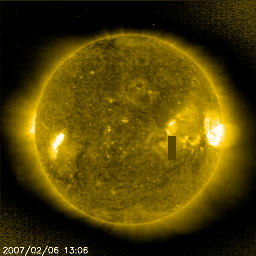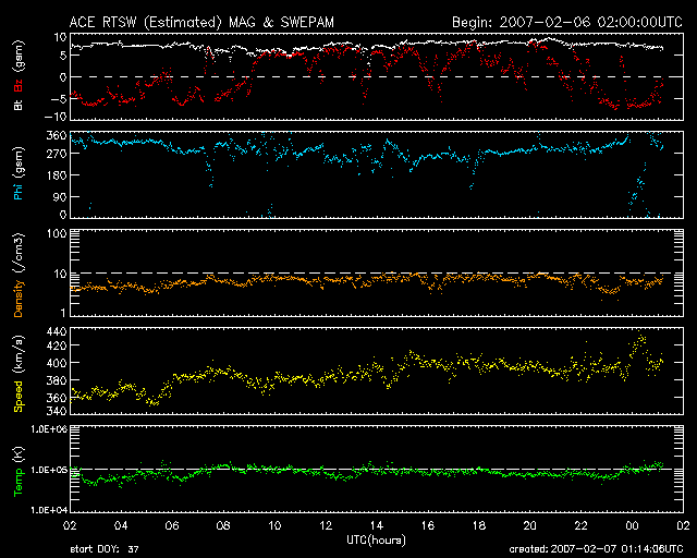 2007/ 2/ 7 10:15 更新 太陽風磁場がやや強まっています。小規模の高速風が来るかもしれません。 担当 篠原 太陽風が、前周期とよく似た変化を続けています。 昨日のニュース以降、磁場強度は7〜8nTに上がり、 やや強まった状態というのがはっきりと見えるようになりました。 一方、速度もゆっくりと上がり始め、350km/秒から400km/秒へと変化しています。 27日周期の図を参照してください。 太陽風の速度(緑線)、磁場強度(青線)に注目してください。 今周期、2月5-6日の変化と、前周期、1月9-10日の変化が、とてもよく似ています。 この様子だと、今日、これから速度がもう一段上昇して、 500km/秒を超えるくらいに上がる可能性があります。 高速状態は1日程度続くと見込まれます。 この太陽風の変動は、規模としては小さなものです。 しかし、きれいに回帰しているので興味が持たれます。 AE指数を見ると、3カ所ほどに小規模の変化が見えています。 まだ、観測点の数が少ないので、本当はもう少し活動的だった可能性はあります。 特に、ACEの図の前半では、太陽風磁場が-5nTの南向きになっていたので、 ある程度磁気圏への影響があったはずです(低速なので大きな影響ではありませんが)。 現在は、磁場強度がやや強まっていて、速度も通常レベルに戻っていますので、 中規模のオーロラ活動が発生しやすい状態になっています。 今後、速度が上がって行くと、より活動が起こりやすくなります。 もう少し先のことを検討します。 27日周期によると、2月11日から次の高速風がやってきそうです。 その発生源となるコロナホールが、太陽の東側にやってきているのですが、 前周期と比較すると、近くに明るい領域が発生していて(黒点にはなっていない様です)、 コロナホールの規模が狭められているように見えるのです。 SOHO EIT284の、最新の写真(左)と、27日前の写真(右)を比べてください。 右の写真では、太陽面の南東(左下)に縦に長く暗い影(コロナホール)が見えるのに、 左の昨夜の写真では、その影は弱まっています。 もう2日ほどすると、コロナホールは太陽の中心に達し、 よりはっきりと状況が見えるようになるでしょう。 太陽面にどのような変化が発生したのか、注目されます。 940黒点群は、西側に没しようとしています。 太陽のフレア活動は穏やかです。 SOHO衛星のEIT284カメラの映像 (c) SOHO (ESA & NASA)