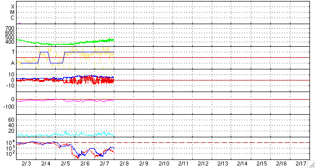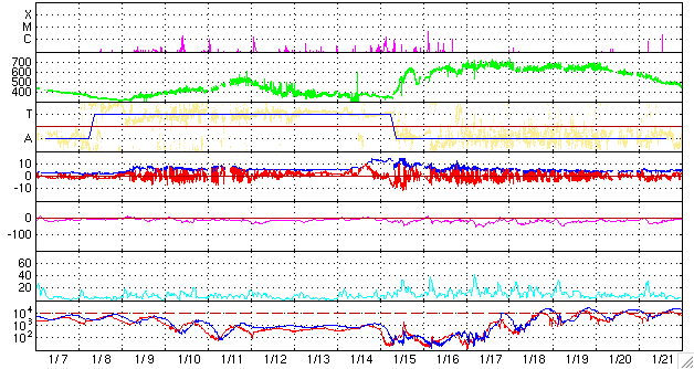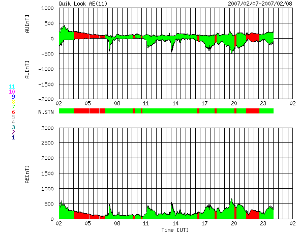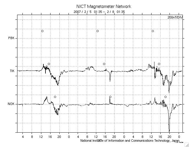 ACEが観測した太陽風の磁場(1番上の枠、白線は全体の強度、赤線は南北成分) および、太陽風の密度(3番目の橙線)、速度(4番目の黄線) (c) NOAA/SEC ![]() リアルタイムAE指数 下段のAEグラフの値が高くなると、オーロラ活動が活発化しています。 (c) 京都大学, NICT ![]() シベリアで観測された3日間の磁場データ 右側の3分の1が、昨日のデータになります。グラフが上がったり下がったりすると、オーロラ活動が活発化しています。 (c) NICT ![]() 27日の太陽周期に合わせたデータプロット 太陽が同じ面を地球に向けていた27日前の変化から、今後を予想することができます。 (c) NICT