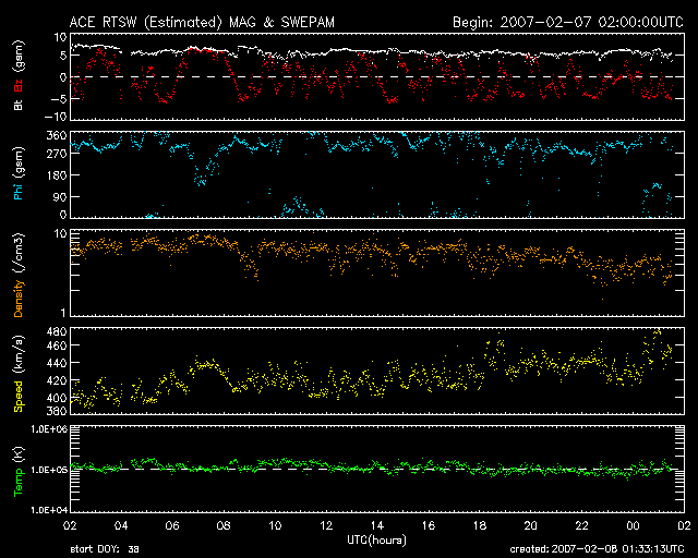 2007/ 2/ 8 10:34 更新 小規模のオーロラ活動が頻繁に発生しています。速度が通常レベル(440km/秒)で、磁場が南北に変動しているためです。 担当 篠原 速度が上昇するかと思われた太陽風ですが、目立った変化はなく、 400km/秒から440km/秒へやや上がった程度でした。 前周期に見られていた速度の盛り上がりはなくなってしまった様です。 太陽風の磁場は、強度が6nT前後で安定しています。 南北成分が細かく変動していて、 -5nTの南向きから、+5nTの北向きまで、ひんぱんに振れています。 しっかりした振幅の南向きが見られていることと、 速度が通常レベルまで回復していることが重なって、 小規模ですがオーロラ活動が活発に起きています。 AER指数を見ると、500nTレベルの変動がたくさん観測されています。 極域の空はなかなかにぎやかだった様です。 シベリアの磁場データでも、この変動を見ることができます (この磁場データは、AE指数の基礎データのひとつです)。 右端の3分の1が昨日1日分の変化です。 マイナス方向へのとがった変化が、TIKで3度見えていますが、 この時にオーロラ爆発が発生しているのです。 昨日、コロナホールの様子が変わったようだとお伝えしましたが、 SOHO EIT284の長期間の写真を比較して、コロナホールの変化を見てみましょう。 今日の1枚目の写真は、2006年7月から今月までの、 27日おきの太陽写真を動画にしたものです。 太陽面の南東(左下)に見えるコロナホール(周囲より暗い領域)の形が、 時間をかけて変化している様子が分かります。 形や場所は微妙に動きますが、常に暗い影が見えています。 この間、高速風もまた、規模が大きくなったり小さくなったりしながらも、 安定的に繰り返し地球へやって来ました。 そして、最後の写真(昨日)では、そのコロナホールが見にくくなっているのが分かります。 明るい領域が出現したことと関係している様ですが、 消えてしまったのでしょうか、見えにくくなっただけなのでしょうか。 そして、この影響で高速太陽風がどうなるのか、今後の変化が注目されます。 高速風が回帰してくるのは、11日頃になると予想されます。 太陽のフレア活動は穏やかです。 新しい黒点群は特に見られません。 SOHO EIT284の写真では、問題のコロナホールのすぐ左隣に明るい領域が見えています。 磁場構造も存在しているのですが、黒点としては見えていない様です。 SOHO EIT284による、2006年7月から2007年2月までのコロナホールの長期変化。 (c) ESA & NASA ![]() SOHO衛星のEIT284カメラの映像 (c) SOHO (ESA & NASA)