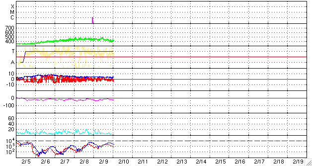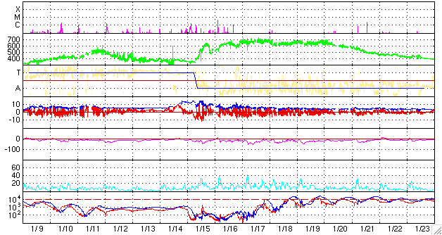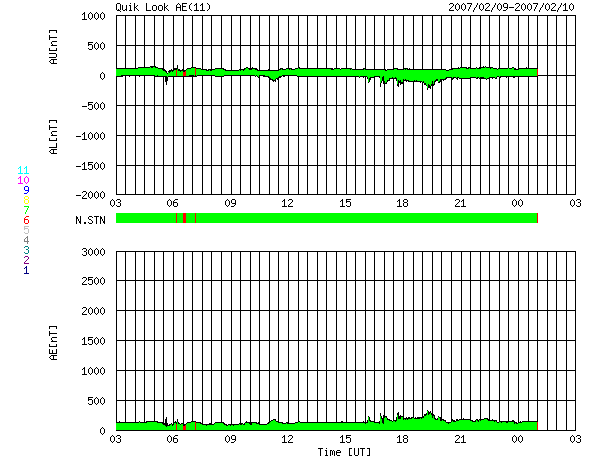 ACEが観測した太陽風の磁場(1番上の枠、白線は全体の強度、赤線は南北成分) および、太陽風の密度(3番目の橙線)、速度(4番目の黄線) (c) NOAA/SEC ![]() リアルタイムAE指数 下段のAEグラフの値が高くなると、オーロラ活動が活発化しています。 (c) 京都大学, NICT ![]() 27日の太陽周期に合わせたデータプロット 太陽が同じ面を地球に向けていた27日前の変化から、今後を予想することができます。 (c) NICT