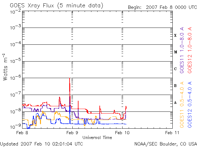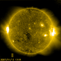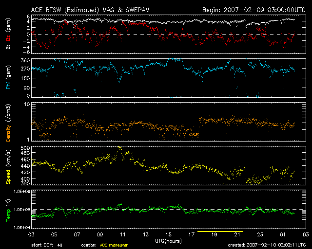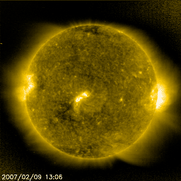 2007/ 2/10 11:03 更新 太陽風は普段のレベルで、磁気圏は穏やかです。明日以降の太陽風の変化が注目されます。 担当 篠原 SOHOのEIT 284で、コロナホールが良く見えてきました。 昨夜の写真(左)と、27日前に太陽が同じ面を地球に向けていた時の写真(右)を比較しましょう。 右の写真では、太陽の中心からやや下がったところに黒く見える部分があります。 ここがコロナホールと呼ばれる領域です。 コロナホールでは、太陽が持っている磁場が、宇宙空間に向かって広がっています。 そして、熱いコロナガスが、磁力線に沿って太陽の外へ勢いよく飛び出しているのです。 飛び出したガスは高速の太陽風となって、地球に磁気嵐などを起こします。 コロナホールでガスが噴き出しているため、SOHOの写真では周囲よりも暗く見えるのです。 さて、2枚の写真を比較すると、左側の最新の写真では、 コロナホールのあった場所に明るい領域ができています。 その影響で、コロナホールが見えにくくなってしまったか、 コロナホールの構造が消えてしまったように思われます。 その一方、明るい領域の左下には、別の暗い領域ができています。 新しくこちら側がコロナホールになっているのかもしれません。 27日前のデータを参考にすると、高速風が前回同様にやってきた場合は、 明日、11日くらいから太陽風に乱れが始まると予想されます。 しかし、SOHOの写真では、コロナホールの分布が変わっている様です。 もし、前に見えていたコロナホールが弱まり、新しく左側にできているのだとすると、 高速風の始まりは、1〜2日ほど遅くなるでしょう。 そして、SOHOの写真の印象では、 高速風の規模は、全体的に小さくなるかもしれません。 今後の変化が注目されます。 前回は、最高速度が700km/秒に達し、6日間にわたって500km/秒を超えるという、 ずいぶん立派な高速風領域でした。 さて、現在の太陽風は、速度420km/秒、磁場強度5nTで、平均的な状態にあります。 磁場の南北成分は、+3nTから-3nT程度で小さな変化を示しています。 そのため、オーロラ活動は概ね静穏で、AE指数には目立った変化は見られません。 今日いっぱいは静穏な状態が続くでしょう。 明日以降は、高速風の到来次第となります。 高速風がやってくる時は、初めに磁場強度が強まる傾向があります。 磁場が大きく南を向きやすくなり、磁気嵐や激しいオーロラ活動をもたらします。 太陽のフレア活動は静穏です。 X線グラフの強度は、とても低いレベルに下がっています。 941黒点群は西に没しつつあり、太陽の黒点は見えなくなってしまいそうです。 SOHO衛星のEIT284カメラの映像 (c) SOHO (ESA & NASA)