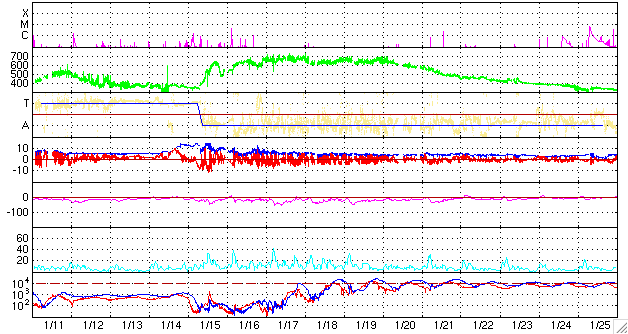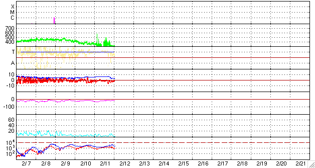 ACEが観測した太陽風の磁場(1番上の枠、白線は全体の強度、赤線は南北成分) および、太陽風の密度(3番目の橙線)、速度(4番目の黄線) (c) NOAA/SEC ![]() リアルタイムAE指数 下段のAEグラフの値が高くなると、オーロラ活動が活発化しています。 (c) 京都大学, NICT ![]() 27日の太陽周期に合わせたデータプロット 太陽が同じ面を地球に向けていた27日前の変化から、今後を予想することができます。 (c) NICT