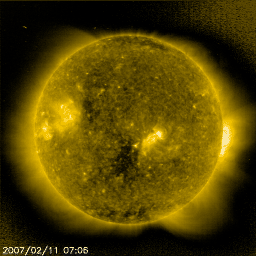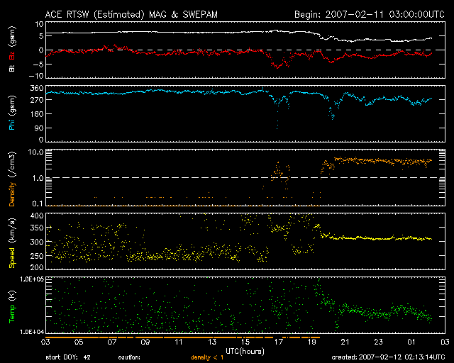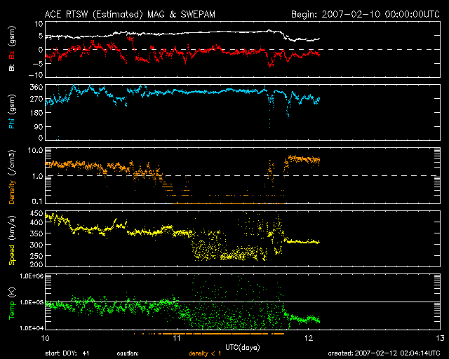 2007/ 2/12 11:14 更新 太陽風の密度がたいへん小さくなりました。太陽風は低速で、磁気圏は穏やかです。 担当 篠原 昨日のお昼から、太陽風の密度がとても低い状態になりました。 ACEの図の3段目の橙色の線が、太陽風の粒子密度を示しています。 グラフが下限いっぱいの、0.1個/ccにまで下がっています。 参考のため、3日幅のACEの図を1枚目に掲載します。 約1日にわたって、グラフのまん中に穴があいた様になっています。 ここまで少なくなると、粒子測定器が測定限界に達する様です。 速度のグラフ(黄色)は、点が散らばった様になっていて、正確な速度が読み取れません。 太陽風の粒子が減ると、地球の磁気圏に与える圧力が弱まるため、 普段押しつぶされている磁気圏が、外側へ大きく広がります。 昨日1日間は、磁気圏もリラックスした状態だったのでしょう。 低密度状態は、今朝、12日5時(世界時11日20時)頃に終わりました。 現在は、密度も4個/ccと普段の数に戻っています。 速度はとても低速です。密度回復後は300km/秒で安定しています。 磁場強度は4nTと通常の強度です。 太陽風磁場に乱れがないことから、高速風の到来はもうしばらく先の様です。 SOHO EIT284の太陽写真では、まん中やや南寄りに、 コロナホールの暗い姿がしっかりと見えています。 ちょうど今、地球向きにまっすぐ高速太陽風を吹きだしているのです。 この写真のときに飛び出した太陽風は、3日ほどかけて、 14日頃に地球へやって来るでしょう。 高速風の始まりは、明日、13日頃と予想されます。 太陽風磁場の強まりが始まると、いよいよです。 太陽風がとても低速ですので、 現在の磁気圏活動はとても穏やかです。 太陽は無黒点のままです。 活動的な領域がほとんど見られないため、X線グラフの強度はとても低い状態です。 EIT284の太陽写真の東側にも明るい領域はなく、 新しい黒点群が上がって来ることもなさそうです。 フレア活動は今後も穏やかでしょう。 ACE衛星が観測した、過去3日間の太陽風の変化。3列めの橙色線が粒子密度。まん中の部分が大変低くなっています。横軸の数字は日付になります。 (c) NOAA/SEC ![]() SOHO衛星のEIT284カメラの映像 (c) SOHO (ESA & NASA)