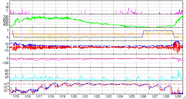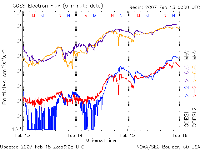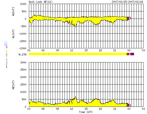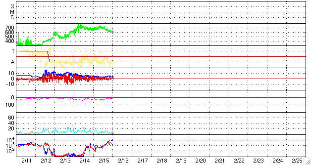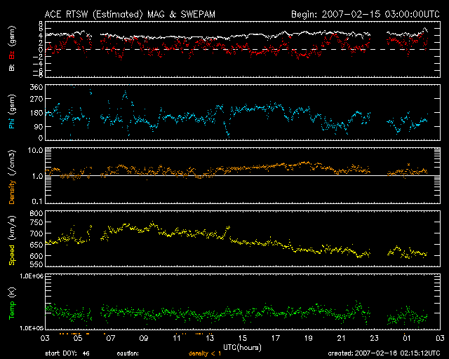 2007/ 2/16 11:16 更新 太陽風はとても高速です(600km/秒)が、次第に下がり始めています。放射線帯高エネルギー電子が増加しています。 担当 篠原 高速風領域は、山を超えた様です。 昨日はずっと650〜750km/秒のかなり高速の太陽風が続いていましたが、 ちょうど日が変わった頃、16日0時(世界時15日15時)に650km/秒を切り、 その後は下がり続けて、現在、600km/秒となっています。 下がったと言っても600km/秒ありますので、まだかなり高速です。 一方、オーロラ活動の方は、やや地味になっています。 AE指数を見ると、連続的に活動は見られていますが、 その変化は500nT程度で、比較的小規模です。 昨日のニュースのデータと比較すると、 高速風はおなじくらいだったのに、オーロラ活動は明らかに弱まっています。 参考に、シベリアの3日間の磁場データもご覧下さい。 3日間の活動の山が3つ見えていますが、右端の昨日の変化は、だいぶ弱まっています。 その原因は、太陽風磁場の違いにあると思われます。 昨日と比較すると、太陽風の磁場強度は、6nT前後から4nT前後へと弱まりました。 また、南向きの変化も、昨日は-3nTくらいは見られたのに、 今日の図では-2nTに達するかどうかという強さです。 もちろん、それほど大きな差ではありませんが、 磁場強度が弱まり、南向きも現れにくくなった結果として、 磁気圏活動は小規模になっていったのでしょう。 さて、高速風領域は後半に入りました。 今後も、速度はゆっくりと下がり続けるでしょう。 明日までは、500km/秒台の高速状態が続くかもしれません。 そして、明後日には高速風帯を抜け出すのではないかと思います。 放射線帯の高エネルギー電子が、ぐんぐん増加しています。 ちょうど、衛星の片方が警戒ラインの10000に達したところです。 更に増加すると思いますので、衛星の運用ではしばらく注意が必要となるでしょう。 太陽のフレア活動は穏やかです。 相変わらず黒点は見えません。 X線のグラフがざわついてきましたので、小さな活動領域が見えて来たのかもしれません。 SOHO衛星はデータ取得のお休み期間に入っています。 と、ちょうどここで、C1の小さな小規模フレアが観測されました。 領域などは不明ですが、活動的な黒点群が東側から上がって来たのでしょうか。 ACEが観測した太陽風の磁場(1番上の枠、白線は全体の強度、赤線は南北成分) および、太陽風の密度(3番目の橙線)、速度(4番目の黄線) (c) NOAA/SEC ![]() リアルタイムAE指数 下段のAEグラフの値が高くなると、オーロラ活動が活発化しています。 (c) 京都大学, NICT ![]() シベリアで観測された3日間の磁場データ 右側の3分の1が、昨日のデータになります。グラフが上がったり下がったりすると、オーロラ活動が活発化しています。 (c) NICT ![]() 27日の太陽周期に合わせたデータプロット 太陽が同じ面を地球に向けていた27日前の変化から、今後を予想することができます。 (c) NICT