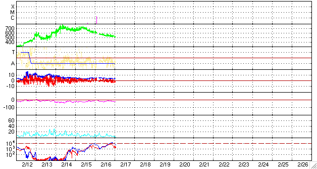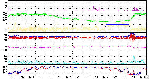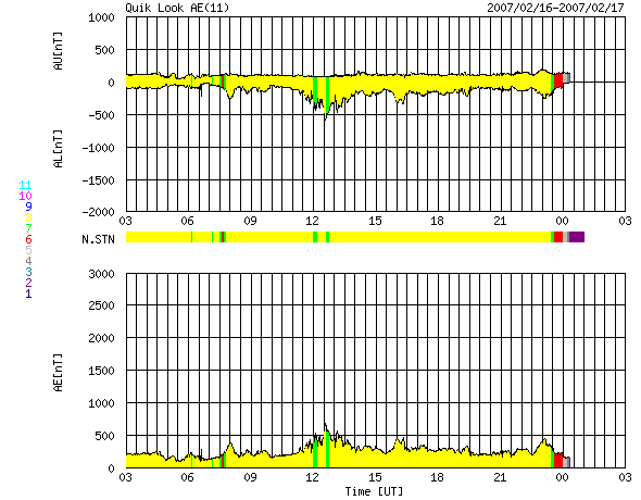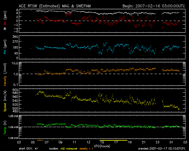 2007/ 2/17 11:15 更新 太陽風の速度は500km/秒を割りつつあります。明日には高速風を抜け出すでしょう。 担当 篠原 太陽風の速度はゆっくりと低下して、高速風は終盤を迎えています。 昨日のニュースの時点では、太陽風速度は600km/秒とまだかなりの高速でしたが、 その後も低下は続いて、現在、500km/秒を割りつつあります。 今後も低下は続き、今日いっぱいか、 明日には地球は高速風帯を抜け出すことになるでしょう。 その後は、かなり長い期間穏やかな日が続くと予想されます。 27日周期の図を見てください。 上の段の27日前の変化を見ると、次の乱れは右の端、1月29日に始まっています。 これは、今周期では2月25日に相当します。 来週いっぱいは穏やかに推移しそうです。 低下を続けてはいるものの、昨日から今日にかけて、 速度自体は500km/秒台を保っていて、立派な高速風でした。 しかし、オーロラ活動は小規模なものだけです。 AE指数では500nTの変化がひとつ目立つだけで、あとは小さな乱れが見える程度です。 これは、太陽風磁場の南北成分が、 0nTを中心として小幅の変化をするだけだったためだと思われます。 速度が高くても、磁場が南を向かなければ、オーロラのスイッチは入りません。 今後は、速度が一段と下がって行くため、 オーロラ活動は一層穏やかなものとなるでしょう。 放射線帯の高エネルギー電子の増加は止まっています。 ぎりぎり警戒ラインに達した程度です。 この様子だと、2〜3日で警戒ラインを切ることになるのではないでしょうか。 昨日、速報の様な形になりましたが、太陽でC1.7の小規模フレアが発生しています。 東端に新しく現れた942黒点群が起こしたとのことです。 かなり小さな黒点群の様です。 掲載の写真では姿が見えませんが、現れる前に撮影されたのではないかと思います。 明日になれば、はっきりとするでしょう。 X線グラフのレベルはほとんど変化していません。 フレア活動は基本的には、穏やかなままでしょう。 ACEが観測した太陽風の磁場(1番上の枠、白線は全体の強度、赤線は南北成分) および、太陽風の密度(3番目の橙線)、速度(4番目の黄線) (c) NOAA/SEC ![]() リアルタイムAE指数 下段のAEグラフの値が高くなると、オーロラ活動が活発化しています。 (c) 京都大学, NICT ![]() 27日の太陽周期に合わせたデータプロット 太陽が同じ面を地球に向けていた27日前の変化から、今後を予想することができます。 (c) NICT
