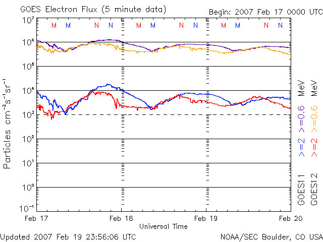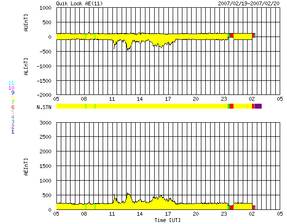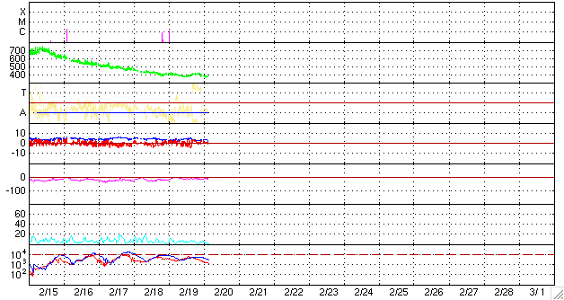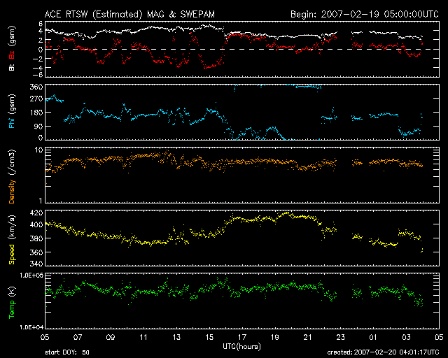 2007/ 2/20 13:02 更新 穏やかな太陽風が続いています。新しく943黒点群が出現しました。 担当 篠原 太陽風は380〜400km/秒の速度で、通常のレベルで概ね安定しています。 磁場強度は、3〜4nTでやや弱め。 全体的には、穏やかな太陽風が続いています。 この状態は、今週いっぱい、24日まで続くと予想されます。 太陽風は穏やかなのですが、太陽風磁場が南に偏る変化をしたために、 小規模ですがオーロラ活動が発生しています。 ACEの図を見ると、中心付近で、-4nTの南向きが数時間続いています。 この影響により、AE指数に500nT程度の小規模の変動が発生しました。 その他の時間帯では、磁気圏活動はたいへん穏やかでした。 今後も基本的には静穏に推移するでしょう。 放射線帯の高エネルギー電子は減少に向かっています。 警戒ラインからはだいぶ離れました。 太陽では、中心付近に943黒点群が出現しました。 規模は小さく、写真でもやっと見える程度です。 昨日お知らせした小規模フレア(C1.1でした)は、ここで発生していたとのことです。 X線のグラフが小さく変化していることから、 この後も、小規模のフレアが発生するかもしれません。 ACEが観測した太陽風の磁場(1番上の枠、白線は全体の強度、赤線は南北成分) および、太陽風の密度(3番目の橙線)、速度(4番目の黄線) (c) NOAA/SEC ![]() リアルタイムAE指数 下段のAEグラフの値が高くなると、オーロラ活動が活発化しています。 (c) 京都大学, NICT ![]() 27日の太陽周期に合わせたデータプロット 太陽が同じ面を地球に向けていた27日前の変化から、今後を予想することができます。 (c) NICT