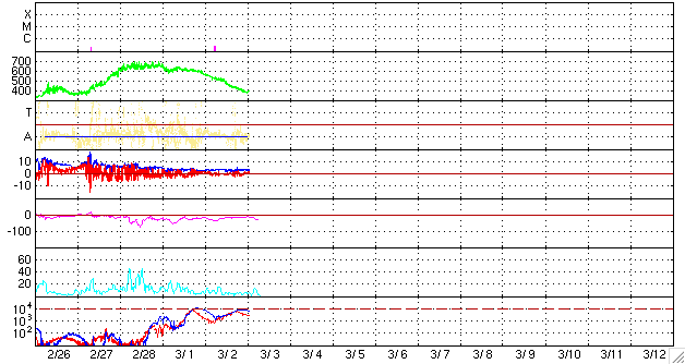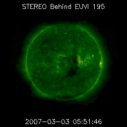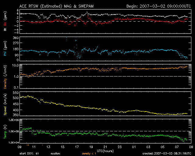 2007/ 3/ 3 17:31 更新 太陽風の速度は下がり、低速風になっています(350km/秒)。磁気圏は穏やかです。 担当 篠原 今日は、NICT全体で何か作業が行われていたようで、 Webページなど、ネットワークへのアクセスができなくなっていました。 先ほど回復した様ですので、現時点の宇宙天気について報告致します。 更新が遅くなり、申し訳ありませんでした。 さて、太陽風はどんどん速度が下がり、 今日のお昼、3日13時(世界時3日4時)には350km/秒にまで下がってしまいました。 1日前はまだ500km/秒を超えるほどでしたので、思ったよりも早い低下でした。 27日周期の図で、前周期の下がり具合と比較してみてください。 今周期は、後を引かずにすぱっと下がっています。 太陽風磁場も、3nTくらいに弱まっています。 南北成分は0nT付近で変化していて、磁気圏への影響はとても小さくなっています。 シベリアの磁場データをご覧下さい(右側3分の1が、昨日から1日分のデータです)。 オーロラ活動はほとんど見られていません。 昨日書きましたが、STEREO衛星の太陽写真では、 太陽の中心にコロナホールが広がっているように見えます。 これは、前周期のSOHOの写真では、ほとんど見られなかったものです。 ただ、前周期はSOHO、今周期はSTEREOと、観測器が変わっているので、 単純には写真同士を比較できません。 というのは、写真の写り具合は調整ひとつでずいぶん変わってしまうためです。 STEREOの写真どうしを見比べるだけでも、コロナホールがはっきりと見えたり、見えにくくなったり、 かなり変化しています。 (現在、本格的な運用へ向けて、カメラの調整を行っているのではないかと思います) 写真に見えている通りに、しっかりとしたコロナホールが広がっているのなら、 明後日あたりから地球に高速風がやって来ると予想されます。 ACEのデータに注目してください。 放射線帯の高エネルギー電子は、増加が止まっています。 警戒ラインをやや下回っており、今回の高速風ではそれほど増加しなかった様です。 太陽では、944黒点群がBクラスの小さなフレアを起こしています。 X線のグラフではとても目立って見えますが、 それは、他が静かなためで、規模自体はとても小さなフレアです。 太陽のフレア活動は穏やかに推移するでしょう。 また、945黒点群は、わずかに見えている様です。 STEREO衛星紫外線望遠鏡EUVI195の太陽写真。3日15時(世界時3日6時) (c) NASA ![]() ACEが観測した太陽風の磁場(1番上の枠、白線は全体の強度、赤線は南北成分) および、太陽風の密度(3番目の橙線)、速度(4番目の黄線) (c) NOAA/SEC ![]() シベリアで観測された3日間の磁場データ 右側の3分の1が、昨日のデータになります。グラフが上がったり下がったりすると、オーロラ活動が活発化しています。 (c) NICT ![]() 27日の太陽周期に合わせたデータプロット 太陽が同じ面を地球に向けていた27日前の変化から、今後を予想することができます。 (c) NICT