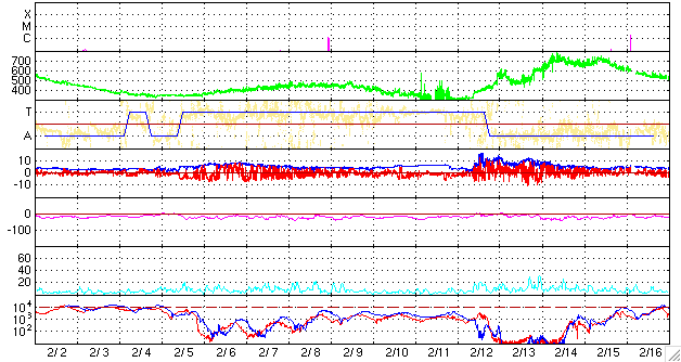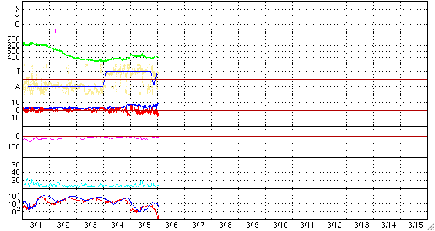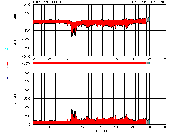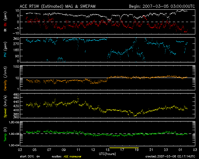 2007/ 3/ 6 11:17 更新 太陽風の速度は通常のレベルです(400km/秒)。磁場強度が強まっており、速度が上昇するかもしれません。 担当 篠原 昨日、やや高まった太陽風速度ですが、 5日21時(世界時5日12時)頃には下がってしまい、その後400km/秒で安定しています。 一方の磁場強度も、速度同様に7nTから5nTにやや低下したものの、 今朝になって、10nTへ強まりを見せています。 27日周期の図を見ると、前周期に速度が高まったのは、2月7-9日でした。 これは今周期では今日以降、3月6-8日に相当します。 従って、これから再び速度が上がり、高速風らしい変化が見られる可能性があります。 磁場強度の強まりが維持されていることも、この変化と関係しているように思います。 昨夜は、速度がやや高まったところで、-5nTの南向き磁場がやってきました。 その影響で、800nT規模のやや活発なオーロラが見られています。 AE指数で5日19時(世界時5日10時)に始まっています。 この時刻のACEを見てください。 ACE衛星は地球から150万km太陽方向に離れています。 太陽風の速度が400km/秒程度の場合は、地球よりも1時間早く太陽風の変化をとらえます。 いいかえると、地球の5日19時(世界時5日10時)は、 ACEの5日18時(世界時5日9時)を見れば良いことになります。 すると、この少し前、5日16時半(世界時5日7時半)くらいから、 太陽風磁場の南北成分(赤線)が、南にかたよっているのが分かります。 この時に、太陽風から地球の磁気圏へエネルギーが流れ込むようになり、 やがてオーロラ活動を起こしたのです。 それ以降も、太陽風磁場は南寄りが続いています。 そのため、AE指数では、300〜500nTくらいの小規模の変化が続いています。 シベリアの磁場データにも、変化が記録されています。 最新の太陽風データでは、南寄りの傾向は更に強まっています。 オーロラの活動が強まりそうです。 さて、少し先の話になりますが、 来週、3月11日から高速太陽風が回帰して来ると予想されます。 27日周期の図で、2月12日に始まっている変化です。 この発生源であるコロナホールの分布が見たいのですが、 SOHO、STEREOともにデータが更新されておらず、分からない状態です。 日頃見えている写真が見られなくなると、気になるものです。 太陽の黒点写真は更新されています。 944群、945群がどんどん西へ移動しています。 どちらも小さい黒点群で、活動も穏やかです。 太陽も穏やかな状態が続くでしょう。 ACEが観測した太陽風の磁場(1番上の枠、白線は全体の強度、赤線は南北成分) および、太陽風の密度(3番目の橙線)、速度(4番目の黄線) (c) NOAA/SEC ![]() リアルタイムAE指数 下段のAEグラフの値が高くなると、オーロラ活動が活発化しています。 (c) 京都大学, NICT ![]() シベリアで観測された3日間の磁場データ 右側の3分の1が、昨日のデータになります。グラフが上がったり下がったりすると、オーロラ活動が活発化しています。 (c) NICT ![]() 27日の太陽周期に合わせたデータプロット 太陽が同じ面を地球に向けていた27日前の変化から、今後を予想することができます。 (c) NICT
