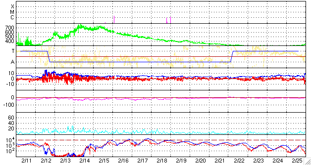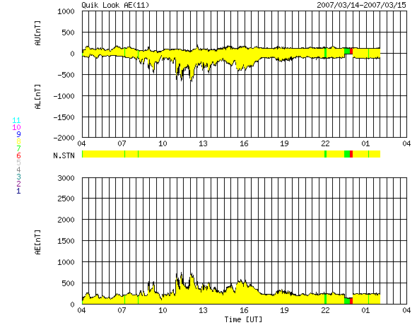 ACEが観測した太陽風の磁場(1番上の枠、白線は全体の強度、赤線は南北成分) および、太陽風の密度(3番目の橙線)、速度(4番目の黄線) (c) NOAA/SEC ![]() リアルタイムAE指数 下段のAEグラフの値が高くなると、オーロラ活動が活発化しています。 (c) 京都大学, NICT ![]() 27日の太陽周期に合わせたデータプロット 太陽が同じ面を地球に向けていた27日前の変化から、今後を予想することができます。 (c) NICT