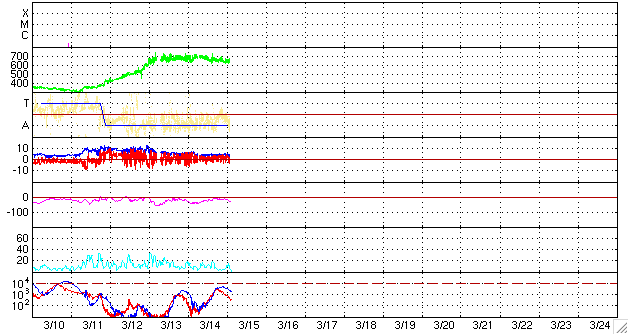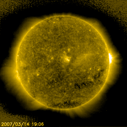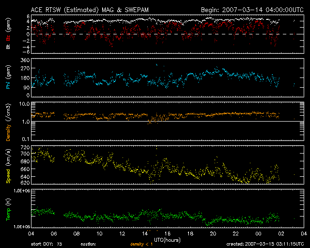 2007/ 3/15 12:12 更新 高速の太陽風が続いています(640km/秒)。もう2〜3日は高速状態が続きそうです。 担当 篠原 高速の太陽風が続いています。 初めに、ACE衛星によるこの1週間の太陽風の図をご覧下さい。 今日の1枚目の図です(横軸は世界時の日付けです)。 この図によると、11日に、太陽風の磁場強度(白線)が強まり、 プラズマ密度(橙色線)が増える変化が起こっています。 コロナホールによる回帰性の高速風の始まりに見られる変化です。 そして、これに続いて、12日に入った頃から速度(黄色線)の上昇が始まりました。 速度が上がり始めるとともに、オーロラの活動度も増しています。 13日には、速度は600km/秒台の後半にまで上昇しました。 AE指数によると、オーロラはこの頃に最も活発な活動を起こしていた様です。 速度が上がるとともに、磁場強度はゆっくりと弱まって行きます。 12日までは10nTに強まっていたのですが、 13日には7nT、14日には5nTと、段階を踏むように弱まっています。 この変化は、高速風が中盤を迎えると見られる変化です。 磁場強度が弱まって来ると、南向き磁場の振幅も小さくなってしまいます。 このため、オーロラの活動も次第に規模が小さくなっていきます。 さて、いつもの1日幅の図に進みましょう。 ACEの1日データを見ると、太陽風の速度は700km/秒から640km/秒へいくらか下がっています。 下がったと言っても、速度としてはまだかなり高速です。 一方、磁場強度は5nTに下がっています。 この影響でしょう。AE指数を見ると、オーロラはある程度連続的に発生しているものの、 規模は次第に小さいものに変わっています。 今日の図では、500nT前後の変化に留まっています。 27日周期の図を見ると、高速風の規模が広がっているように見えます。 前周期のデータでは、2月15日の後半から速度が下がり始めていますが、 今周期の3月14日には目立った低下は見られません。 今後、速度は次第に下がって行きますが、前回よりは速度が高まった状態が長く続くと思います。 放射線帯の高エネルギー電子は、それほど大きな増加にはなっていません。 まだ、10000の警戒ラインよりは低いままです。 高速風は続いていますので、引き続き注目する必要はあります。 太陽は無黒点のままです。 X線データの変化も大変小さく、フレア活動は穏やかです。 ACE衛星による、7日間の太陽風の変化。12日より高速の太陽風が続いている。速度は黄色の線。 (c) NOAA/SEC ![]() SOHO衛星のEIT284カメラの映像 (c) SOHO (ESA & NASA)