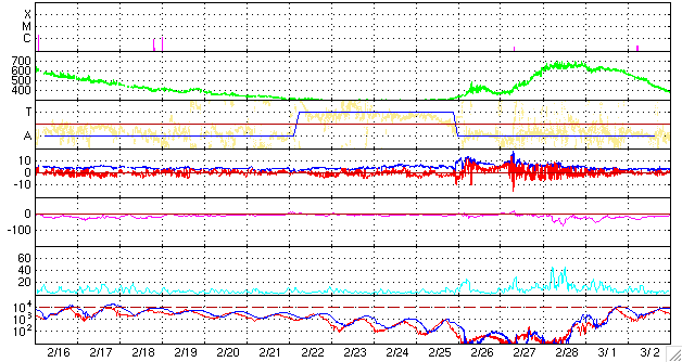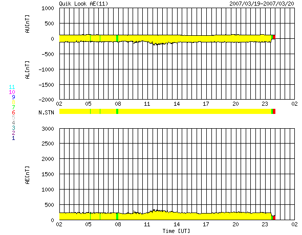 ACEが観測した太陽風の磁場(1番上の枠、白線は全体の強度、赤線は南北成分) および、太陽風の密度(3番目の橙線)、速度(4番目の黄線) (c) NOAA/SEC ![]() リアルタイムAE指数 下段のAEグラフの値が高くなると、オーロラ活動が活発化しています。 (c) 京都大学, NICT ![]() 27日の太陽周期に合わせたデータプロット 太陽が同じ面を地球に向けていた27日前の変化から、今後を予想することができます。 (c) NICT