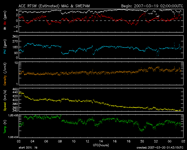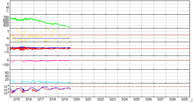 2007/ 3/20 10:44 更新 太陽風の速度は下がり(340km/秒)、低速風になっています。宇宙天気は全般的に穏やかです。 担当 篠原 宇宙天気はたいへん穏やかになっています。 太陽風の速度は更に低下して、昨日の450km/秒から、 現在は340km/秒とすっかり低速風に変わっています。 磁場強度は3〜4nTでやや弱め。 磁場の南北成分は、0nTを中心に推移しており、 地球に影響を及ぼす南向き成分は、時おり小さな振幅が見られる程度です。 このため、地球の磁気圏へのエネルギーの流入は小さくなっていて、 オーロラ活動はたいへん穏やかです。 オーロラ電流の大きさを測るAE指数は、ほとんど変化していません。 今後の太陽風を予想してみましょう。 太陽は、地球から見ると約27日で一回転しています。 従って、27日前、54日前の太陽・太陽風の変化を見ることで、 今後の太陽風を予想することができます。 今日は、SOHO EIT284の写真より、現在の太陽と54日前の太陽を比較してみましょう。 (27日前のSOHOの観測はお休みでした) 2枚のSOHO EIT284の写真は、左が3月19日、右が1月24日のものです。 右の写真を見ると、太陽の中心にぼんやりと明るい領域が見え、 東端(左端)あたりにコロナホールが広がっているのが分かります。 このコロナホールは、5日後の1月29日に地球に高速太陽風をもたらしました。 この写真から、2周期経った太陽が左の写真です。 ここでは、太陽の中心の明るい領域は姿を消して、 その跡に小さな暗い影、コロナホールが見えています。 これは、右の写真では見られなかったものです。 その一方、東端のコロナホールはこの写真でははっきりしなくなっています。 (まだ、太陽の端なので、見にくくなっているだけかもしれません) この様子では、太陽風の周期性が変わっている可能性があります。 現在の太陽の中心に見えているコロナホールから影響がやって来るとすると、 明後日、22日くらいから太陽風に乱れが始まりそうです。 一方、右の写真に見えた東端のコロナホールによって、 3月25日に高速風が回帰してくると予想されていたのですが、 こちらも変化している可能性があります。 (明後日頃のSOHOの写真でよりはっきりとするでしょう) これらの点について、今週から来週にかけての太陽風の変化に注目してください。 放射線帯の高エネルギー電子は、やや高めですが、警戒ライン以下で推移しています。 今後は、ゆっくりと減少して行くでしょう。 太陽は無黒点のままです。 X線のグラフは、全く変化していないと言える状態です。 大変穏やかです。 SOHO衛星のEIT284カメラの映像 (c) SOHO (ESA & NASA)