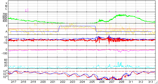 ACEが観測した太陽風の磁場(1番上の枠、白線は全体の強度、赤線は南北成分) および、太陽風の密度(3番目の橙線)、速度(4番目の黄線) (c) NOAA/SEC ![]() リアルタイムAE指数 下段のAEグラフの値が高くなると、オーロラ活動が活発化しています。 (c) 京都大学, NICT ![]() 27日の太陽周期に合わせたデータプロット 太陽が同じ面を地球に向けていた27日前の変化から、今後を予想することができます。 (c) NICT