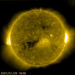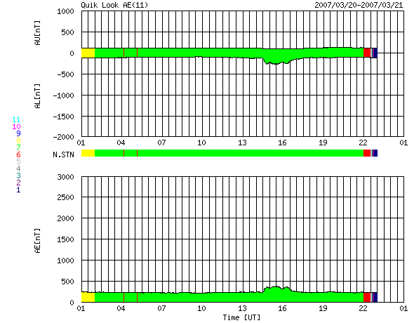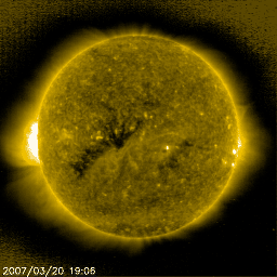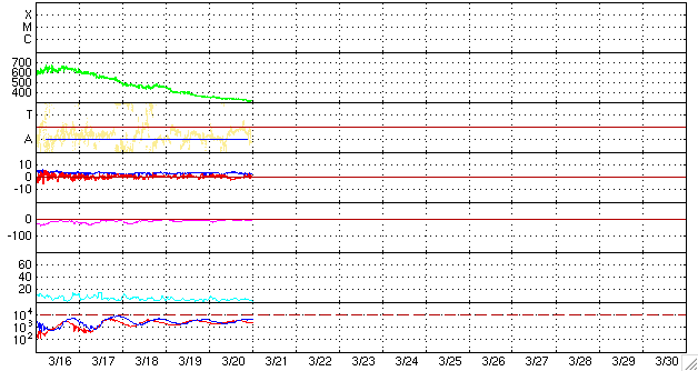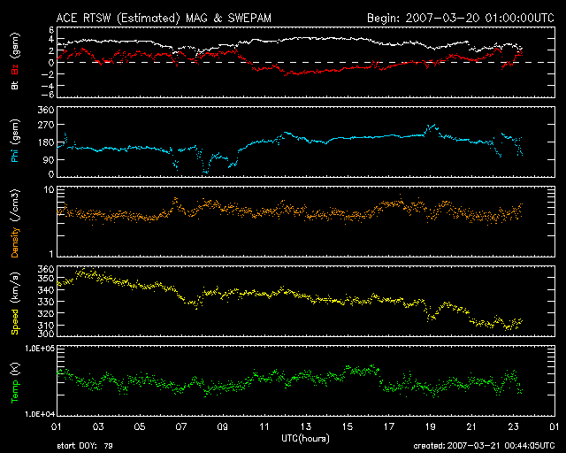 2007/ 3/21 09:45 更新 太陽風はかなり低速になっています(310km/秒)。磁気圏も穏やかです。 担当 篠原 太陽風は引き続き速度が下がり、310km/秒にまで落ちています。 かなり低速の状態です。 磁場強度も2〜4nTと弱めで、たいへん穏やかな太陽風になっています。 このため、オーロラ活動もたいへん穏やかです。 AE指数では、小さな変化がひとつ見えていますが、 その他は、全く変化していません。 太陽風は、今日はこのまま穏やかに推移すると思われます。 明日、小さなコロナホールの影響で、小規模の乱れが始まるかもしれません。 昨日のニュースで、SOHO EIT284の太陽写真で、 コロナホールがまだよく見えていないとお話ししましたが、 今日の写真では、はっきりと見えてきました。 斜めに細長く、黒い影が立派に伸びています。 昨日までは、手前のコロナの影になっていただけでした。 前々周期のコロナホールと比較すると、 北へ移動していて、分布がやや変化しています。 それでも、東西方向の広がりはほとんど同じですので、 以前と同様の高速太陽風がやってきそうです。 コロナホールは、右端が太陽の中心に達していますので、 これから3日後の、24日くらいに太陽風の乱れが始まりそうです。 太陽は無黒点のままです。 フレア活動は全く見られず、たいへん穏やかな太陽が続いています。 SOHO衛星のEIT284カメラの映像 (c) SOHO (ESA & NASA)