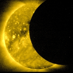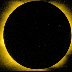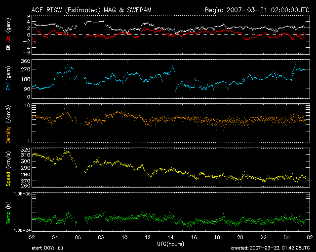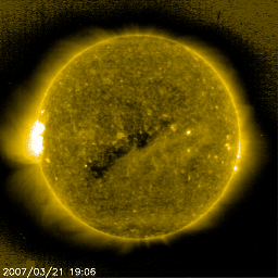 2007/ 3/22 10:43 更新 太陽風はとても低速で(280km/秒)、磁気圏も穏やかです。「ひので」が皆既日食を観測したそうです。 担当 篠原 昨年打ち上げられた太陽観測衛星「ひので」が、皆既日食を観測しました。 日本でも観測されたのですが、今週の月曜日、3月19日に部分日食が起こりました。 地上では、太陽の一部が欠けるだけの部分日食だったのですが、 宇宙空間にいた「ひので」では、皆既日食になっていたそうです。 その時にX線カメラで撮影された太陽の写真が公開されています。 詳細は、国立天文台の報告をご覧下さい。 皆既日食が見られる場所の狭さを考えると、 かなり珍しい観測なのではないかと思いますが、どうなのでしょうか。 宇宙天気はたいへん穏やかに推移しています。 太陽風は速度が280km/秒を切るまでに下がっています。 かなり低速の状態です。 磁場強度も2nT前後で、こちらもだいぶ弱まっています。 このため、磁気圏内部の活動もたいへん穏やかです。 オーロラの活動を示すAE指数のグラフは、ほとんど変化が見られません。 図の中央付近に、ちらちらと小さな変化が見えている程度です。 放射線帯の高エネルギー電子は、やや高めではありますが、 10000の警戒ラインよりも下の状態を保っています。 GOES衛星の太陽X線のグラフは、一番下にべったりくっついているような状態です。 現在も、太陽面は無黒点のままです。 ただ、SOHO EIT284の写真で、東端に明るい領域が見えて来ましたから、 ここに黒点が現れるかもしれません。 そのEIT284の写真ですが、太陽の中心にコロナホールが暗い姿を見せています。 太陽を斜めに横切るように、はっきりと見えています。 太陽の中心線をいくらか通過していますので、 2日後の24日くらいには、太陽風に変化が始まるのではないでしょうか。 27日周期の図の前周期2月の変化よりも、1日程度変化が早まりそうです。 週末から、オーロラ活動が再び活発化しそうです。 3月19日の日食を、太陽観測衛星「ひので」が観測しました。11:53:04(世界時2:53:04)の写真。 (c) 国立天文台 提供 ![]() この日の日食は、地上では部分日食でしたが、宇宙の「ひので」では皆既日食になりました。11:55:40(世界時2:55:40)の写真。 (c) 国立天文台 提供 ![]() SOHO衛星のEIT284カメラの映像 (c) SOHO (ESA & NASA)