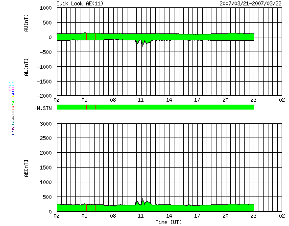 ACEが観測した太陽風の磁場(1番上の枠、白線は全体の強度、赤線は南北成分) および、太陽風の密度(3番目の橙線)、速度(4番目の黄線) (c) NOAA/SEC ![]() リアルタイムAE指数 下段のAEグラフの値が高くなると、オーロラ活動が活発化しています。 (c) 京都大学, NICT ![]() 27日の太陽周期に合わせたデータプロット 太陽が同じ面を地球に向けていた27日前の変化から、今後を予想することができます。 (c) NICT