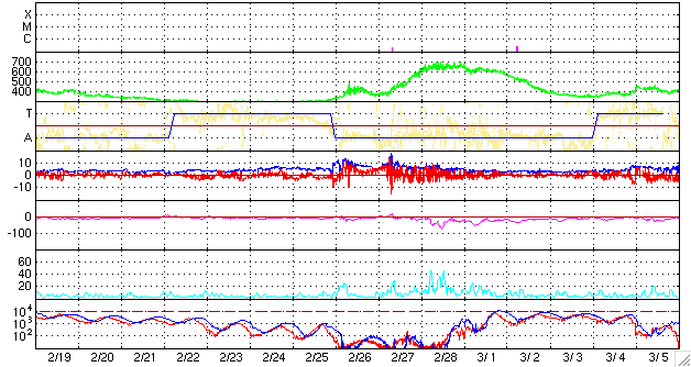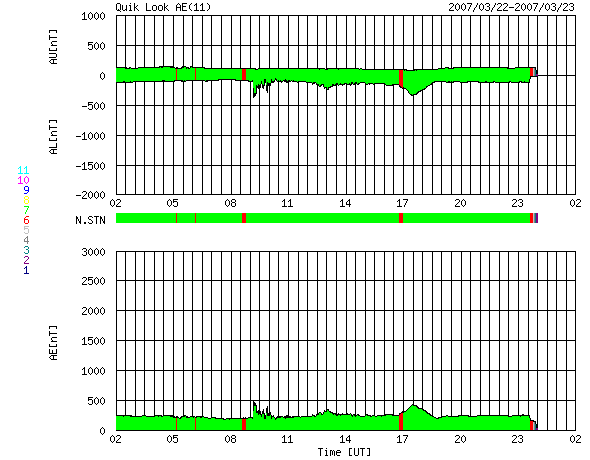ACEが観測した太陽風の磁場(1番上の枠、白線は全体の強度、赤線は南北成分) および、太陽風の密度(3番目の橙線)、速度(4番目の黄線) (c) NOAA/SEC ![]() リアルタイムAE指数 下段のAEグラフの値が高くなると、オーロラ活動が活発化しています。 (c) 京都大学, NICT ![]() 27日の太陽周期に合わせたデータプロット 太陽が同じ面を地球に向けていた27日前の変化から、今後を予想することができます。 (c) NICT