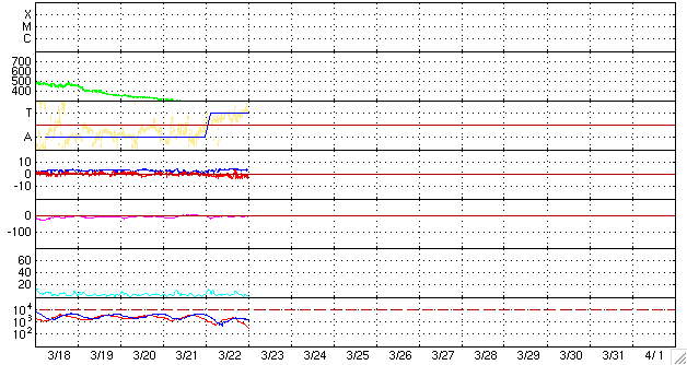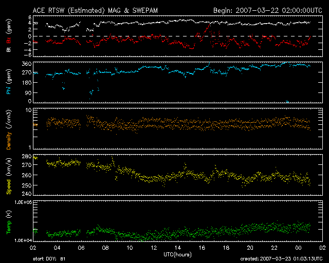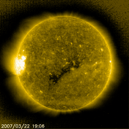 2007/ 3/23 10:04 更新 たいへん低速の太陽風になっています(250〜260km/秒)。明日くらいから、高速の太陽風が来るでしょう。 担当 篠原 たいへん低速の太陽風が続いています。 昨夜より、速度は250〜260km/秒にまで低下しています。 かなり下がった状態と言えます。 以前のニュースで、小規模のコロナホールの影響が見られるかもしれないと書きましたが、 それに相当する変化は、結局見られませんでした。 規模が小さすぎた様です。 太陽風磁場はやや回復して、4nTに上がっています。 南北成分が南寄りの傾向になっていて、 -2nTと振幅は小さいですが、比較的長時間南向きが続いています。 ただ、速度が下がりきっているために、磁気圏への影響は小さなものです。 AE指数には、小さな変化が見えている程度です。 磁気圏活動は概ね静穏だったようです。 SOHO EIT284で、コロナホールが次第に西へ移動しています。 コロナホールの右端が、太陽の中心と、西の端の中間付近に来た頃が、 高速太陽風の始まりのタイミングになります。 この様子では、明日くらいに高速風が始まりそうです。 週末より、オーロラ活動が活発化しそうです。 今日いっぱいは穏やかなままでしょう。 太陽のフレア活動は穏やかです。 黒点は見られない状態が続いています。 SOHO衛星のEIT284カメラの映像 (c) SOHO (ESA & NASA)