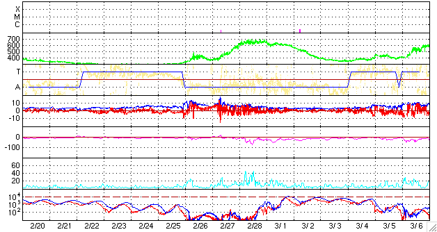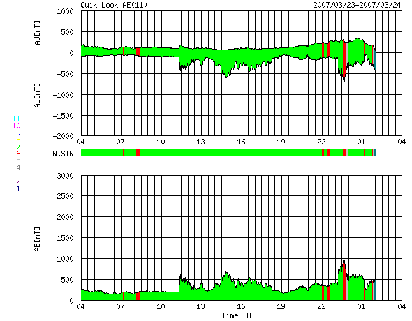 ACEが観測した太陽風の磁場(1番上の枠、白線は全体の強度、赤線は南北成分) および、太陽風の密度(3番目の橙線)、速度(4番目の黄線) (c) NOAA/SEC ![]() リアルタイムAE指数 下段のAEグラフの値が高くなると、オーロラ活動が活発化しています。 (c) 京都大学, NICT ![]() 27日の太陽周期に合わせたデータプロット 太陽が同じ面を地球に向けていた27日前の変化から、今後を予想することができます。 (c) NICT