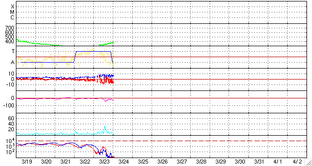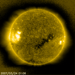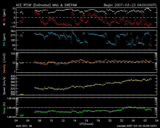 2007/ 3/24 12:07 更新 太陽風磁場が強まり、オーロラ活動が活発になっています。これから高速風がやってきます。 担当 篠原 太陽風に変化が始まっています。 昨日のお昼頃から太陽風の磁場強度が強まり、5nTを超える様になりました。 それから現在まで、5nTと10nTの間で強まったまま変化しています。 27日周期の図の青線を見ると、磁場強度の強まりがよく分かります。 これからやってくる高速太陽風の前触れにあたる変化だと思います。 昨日のニュースで、太陽風磁場の南北成分の南寄りの傾向が続いていると お知らせしましたが、 磁場強度が強まった後も、その傾向は変わらず、 -7nTレベルの強めの南向き磁場が、連続的に現れています。 このため、磁気圏にエネルギーが流れ込みやすくなり、 オーロラ活動が活発化しています。 AE指数では、500nTを超える中規模の変動が度々観測されています。 ただし、昨日から現在にかけて太陽風の速度は300km/秒台の低速状態です。 太陽風磁場の南向きが強まっても、 速度が遅いので大きなエネルギーの流れ込みにはなりませんでした。 もし、高速になっていれば、更に激しい磁気圏活動が見られたことでしょう。 太陽風の速度はまだ低速ですが、上昇の変化は始まっています。 今日のACEの図では、320km/秒から380km/秒へと上がっています。 引き続き上昇し、高速風が始まるでしょう。 その発生源であるコロナホールは、 SOHO EIT284の写真で、太陽の西側半分の場所にほぼ達しています。 速度が高速状態になった時にも、太陽風磁場の南向き傾向が続いていれば、 かなり活発なオーロラ活動が見られたり、磁気嵐が発生することになるでしょう。 高速風は3〜4日程度続くと思われます。 磁気圏活動に伴って、放射線帯の高エネルギー電子は大きく減少しています。 高速風の中盤から再び上昇が見られると思いますので、 明後日以降は注目する必要があります。 太陽では、西の端(右端)近くに小さな黒点が現れています。 947黒点群と番号が付けられています。 掲載している写真でも見えますが、とても小さく、 目を凝らさないと気がつかないでしょう。 X線のグラフで目立った活動は見られず、太陽のフレア活動は穏やかです。 SOHO衛星のEIT284カメラの映像 (c) SOHO (ESA & NASA)