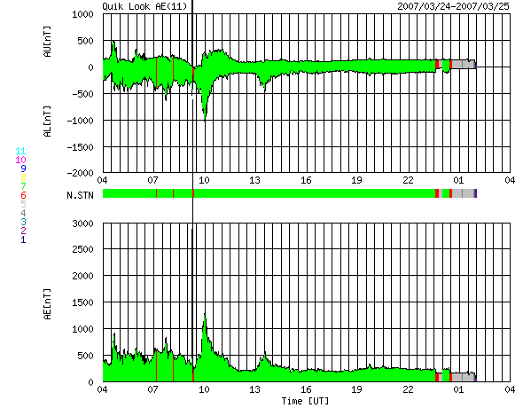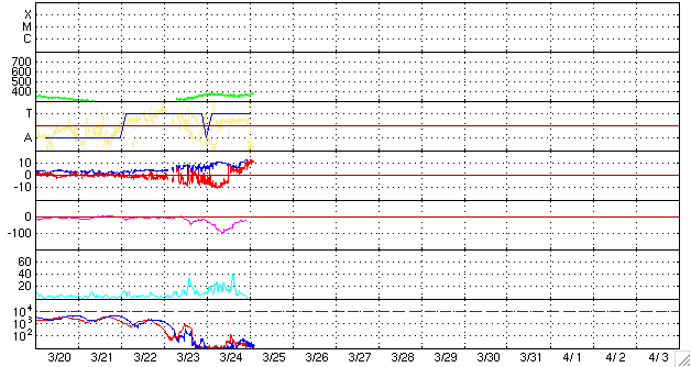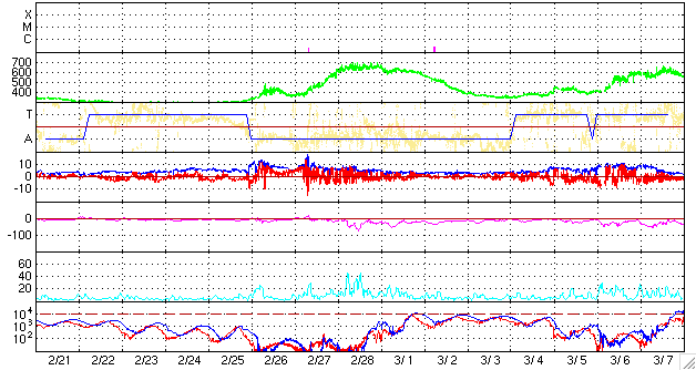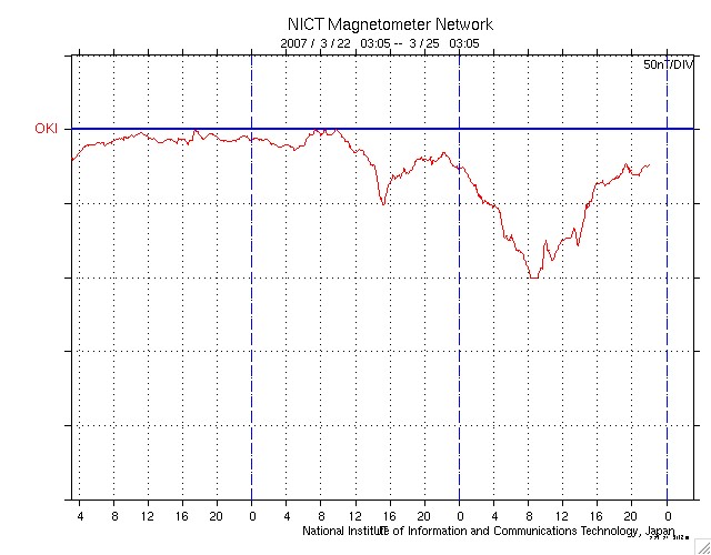 ACEが観測した太陽風の磁場(1番上の枠、白線は全体の強度、赤線は南北成分) および、太陽風の密度(3番目の橙線)、速度(4番目の黄線) (c) NOAA/SEC ![]() リアルタイムAE指数 下段のAEグラフの値が高くなると、オーロラ活動が活発化しています。 (c) 京都大学, NICT ![]() 沖縄の磁場擾乱 下へ下がるほど、擾乱が発達している事を意味します。 (c) NICT ![]() 27日の太陽周期に合わせたデータプロット 太陽が同じ面を地球に向けていた27日前の変化から、今後を予想することができます。 (c) NICT