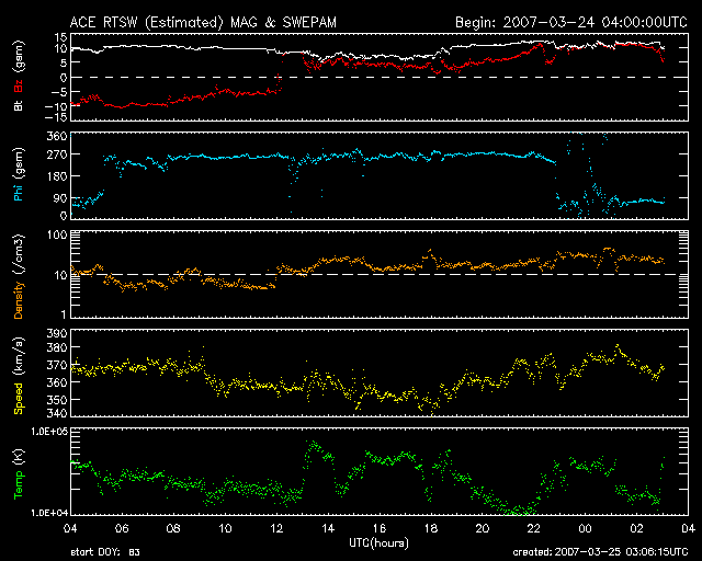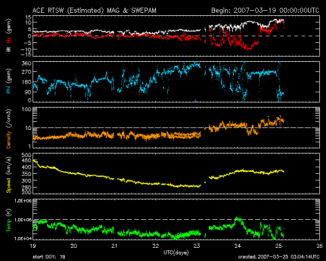 2007/ 3/25 12:06 更新 太陽風の磁場が大きく長時間南を向いたため、磁気圏活動が活発化しました。高速風はこれからです。 担当 篠原 太陽風の速度はまだ上昇を始めていません。 昨日、太陽風磁場強まっていたことから、 これから速度が上がると予想していましたが、高速風の始まりはまだでした。 今日の1枚めの図で、ACE衛星による7日間の太陽風の様子をご覧下さい。 この図によると、23日(世界時)から太陽風磁場の強まりが始まりました。 磁場強度(白線)は、5〜10nTへと上がっています。 同時に速度(黄色線)にも上昇が見られ、ここから更に上がって行くのではと予想しました。 ところが、速度は370km/秒くらいに上がったところで頭打ちとなり、 そのまま安定してしまいました。 ここで特徴的な変化を見せているのが、磁場の南北成分(赤線)です。 磁場強度が強まった頃から、安定的に南(マイナス)に振れています。 特に、24日(世界時)に入ったところから、 -10nTに及ぶ強い南向きが半日にもわたって続いています。 そして、24日のまん中あたりで、急に北向き(プラス)に反転しています。 空間構造として考えると、この点を挟んで、 磁場が大きく渦を巻く様に分布していたと見ることができます。 この様な変化は、太陽から大きな磁気のかたまりが流れてきたときに見られます。 今回、何かそのような現象が太陽で発生していたのかもしれません。 現在の太陽風は、磁場強度が10nTを超えて更に強まっています。 いつもの24時間幅のACEの図をご覧下さい。 昨夜、24日21時(世界時24日12時)に、南向きから北向きへの反転が発生し、 それ以降は、どんどん北向きが強まっています。 今は、磁場強度とほとんど同じレベルの北向き成分を持っています。 一昨日の変化の続きになっているので、読みにくい点がありますが、 SOHO EIT284のコロナホールの位置、 27日周期の図の前周期の変化から予想される周期性などから考えると、 そろそろ速度の上昇が始まると思います。 引き続き、太陽風の変化に注目してください。 さて、昨日は、太陽風磁場の強い南向きが長時間続いたために、 磁気圏の活動がだいぶ活発になりました。 AE指数では、1000nT前後の活発な変動が何度も発生しています。 極域の空はかなりにぎわっていたでしょう。 AE指数の変化が、図の前半にしか見られませんが、 これは、後半では太陽風磁場が北向きに切り替わったためです(オーロラのスイッチが切れた)。 また、小規模の磁気嵐にもなっていたようです。 沖縄の磁場データをご覧下さい。 青線の静穏レベルから、-100nTの磁場強度の減少が見られています。 磁気嵐に伴って、赤道環電流が発達したことを示しています。 世界規模で求められるDst指数では、-70nTの変化になっていました。 太陽風の磁場の乱れとしては、比較的大きな変化だったと思いますが、 速度が400km/秒を切った低速状態でしたので、 エネルギーの流入量としては、それほど大きなものにはなりませんでした。 そのため、この程度の乱れに留まったと考えることができます。 太陽のフレア活動は穏やかです。 947群は規模が縮小しているそうで、掲載の写真では見つけることができません。 太陽は再び無黒点になりそうです。 ACE衛星が観測した、7日間の太陽風の変化。1列めの白線が磁場強度、4列めの黄色線が速度。横軸の数字は日付です。 (c) NOAA/SEC ![]() SOHO衛星のEIT284カメラの映像 (c) SOHO (ESA & NASA)
