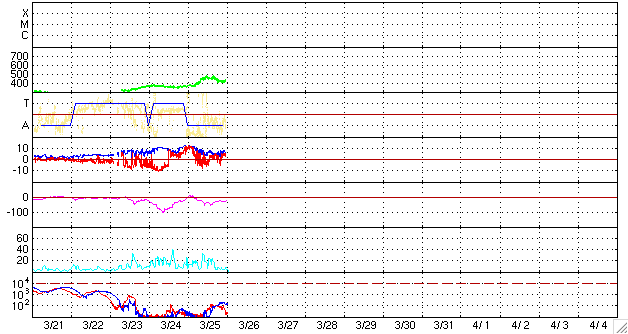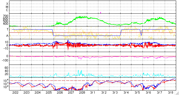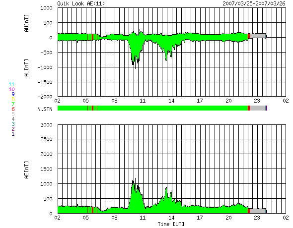 ACEが観測した太陽風の磁場(1番上の枠、白線は全体の強度、赤線は南北成分) および、太陽風の密度(3番目の橙線)、速度(4番目の黄線) (c) NOAA/SEC ![]() リアルタイムAE指数 下段のAEグラフの値が高くなると、オーロラ活動が活発化しています。 (c) 京都大学, NICT ![]() 27日の太陽周期に合わせたデータプロット 太陽が同じ面を地球に向けていた27日前の変化から、今後を予想することができます。 (c) NICT