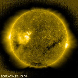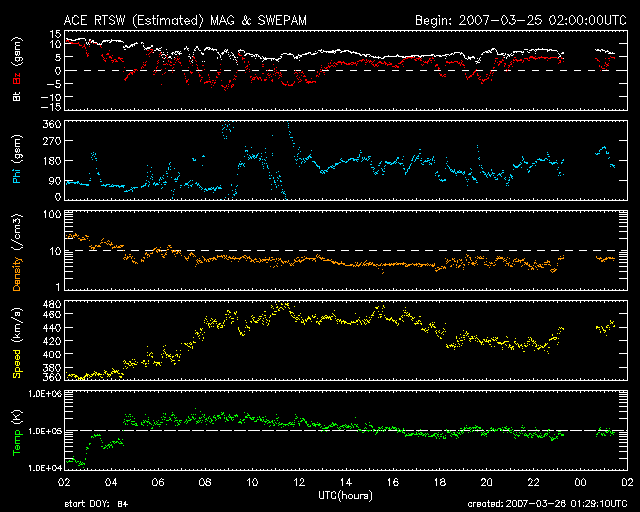 2007/ 3/26 10:30 更新 太陽風は通常の速度レベルです。高速風はこれからやってくることになりそうです。 担当 篠原 太陽風は速度がそれほど上がらず、高速風にはなっていません。 27日周期の図を見ると、結果的に前周期と同じ様な変化になっています。 昨日のニュースの後、太陽風の速度は一旦上昇を始めました。 380km/秒から460km/秒へと上がったのですが、そこで止まってしまい、 半日ほどこの速度を保った後、420km/秒へ下がってしまいました。 高速風が到来すると予感させた磁場強度の強まりも、 この小幅の速度上昇とともに強度が下がり、 5nT前後の通常レベルに落ち着いています。 27日周期の図を見ると、この小幅の速度上昇は、前周期の2月26日にも発生しています。 タイミングとして、ほぼそのまま回帰したと言って良いでしょう。 そう考えると、本格的な高速風の回帰はこれからということになります。 今日、これから再び磁場強度が強まり、 明日にかけて速度の上昇が始まるでしょう。 SOHO EIT284の太陽写真に見えるコロナホールは、既に西半分を過ぎていて、 普段予測の目安としている位置を行き過ぎているくらいです。 このコロナホールの位置関係から、 高速風はもう少し早く来るのではないかと予想したのですが、 難しいところです。 速度がやや高まったことと、-5nTの南向き磁場がやってきたことが重なって、 1000nTクラスの活発なオーロラ活動が記録されています。 現在は速度、磁場強度ともに下がったため、落ち着いていますが、 この後の高速風で、再びにぎやかなオーロラが始まると予想されます。 放射線帯の高エネルギー電子は、低レベルのままで推移しています。 太陽は、947黒点群がほとんど消えてしまったか、 西端に没してしまった様で、無黒点に見えます。 活動的な領域が見られず、フレア活動はたいへん穏やかです。 SOHO衛星のEIT284カメラの映像 (c) SOHO (ESA & NASA)