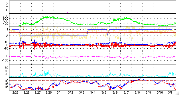 ACEが観測した太陽風の磁場(1番上の枠、白線は全体の強度、赤線は南北成分) および、太陽風の密度(3番目の橙線)、速度(4番目の黄線) (c) NOAA/SEC ![]() リアルタイムAE指数 下段のAEグラフの値が高くなると、オーロラ活動が活発化しています。 (c) 京都大学, NICT ![]() 27日の太陽周期に合わせたデータプロット 太陽が同じ面を地球に向けていた27日前の変化から、今後を予想することができます。 (c) NICT