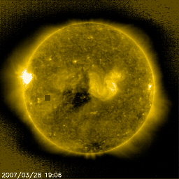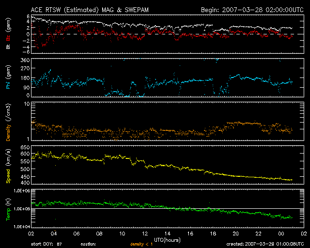 2007/ 3/29 10:01 更新 太陽風の速度は下がり、通常の状態に戻っています。次のコロナホールが見えています。 担当 篠原 速度が550km/秒を超えた高速の太陽風は、半日ほどで終わり、 昨夜、28日20時(世界時28日11時)頃から低下が始まりました。 現在は、430km/秒と通常のレベルに戻っています。 磁場強度も5nTから2nTに弱まり、太陽風は穏やかになりつつあります。 27日周期の図を見ると、 今周期の高速太陽風は、すっかり貧弱になってしまいました。 1日ほど高速風が来ましたが、磁気圏は比較的穏やかでした。 オーロラの活動を示すAE指数には、300nTくらいの変化がありますが、 大きな変動は記録されていません。 これは、太陽風磁場の南北成分があまり南を向かなかったためでしょう。 現在は速度が下がり、磁場強度もすっかり弱まっていますので、 オーロラ活動は一層穏やかとなるでしょう。 SOHO EIT284の太陽写真では、 次のコロナホールの右端が、太陽のまん中に達しています。 このことから、これから3日後の4月1日くらいに、次の高速風がやってきそうです。 前周期の写真が無いので、比較ができませんが、 コロナホールはかなり濃く(暗く)見えています。 今度はしっかりとした高速風がやってくるのではないでしょうか。 太陽では、東端付近に949黒点群が出現しています。 写真でもかろうじて見ることができます(まだ番号は書かれていません)。 X線グラフでBクラスの小さな変動を起こしているのはこの群だそうです。 黒点群としての規模は小さいので、フレア活動としては穏やかに推移するでしょう。 SOHO衛星のEIT284カメラの映像 (c) SOHO (ESA & NASA)