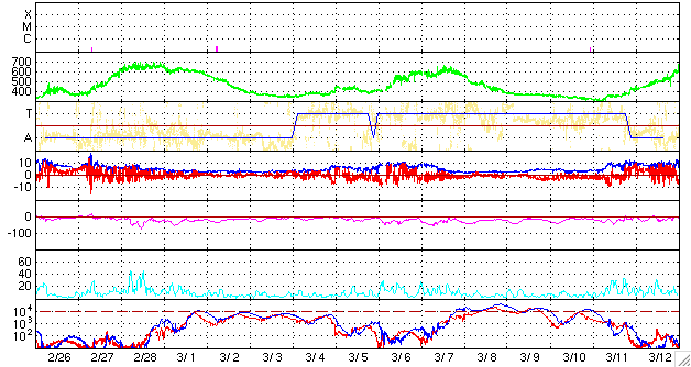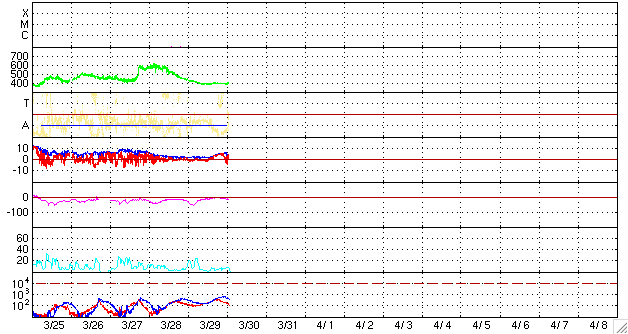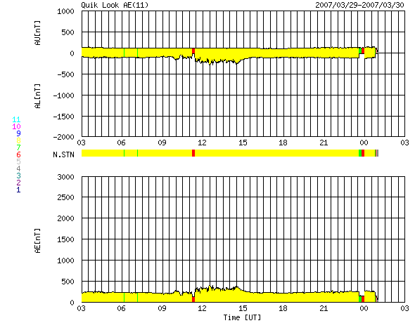 ACEが観測した太陽風の磁場(1番上の枠、白線は全体の強度、赤線は南北成分) および、太陽風の密度(3番目の橙線)、速度(4番目の黄線) (c) NOAA/SEC ![]() リアルタイムAE指数 下段のAEグラフの値が高くなると、オーロラ活動が活発化しています。 (c) 京都大学, NICT ![]() 27日の太陽周期に合わせたデータプロット 太陽が同じ面を地球に向けていた27日前の変化から、今後を予想することができます。 (c) NICT