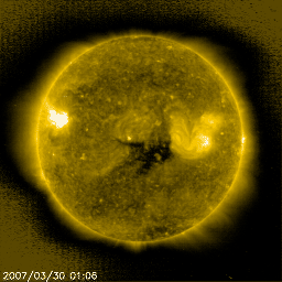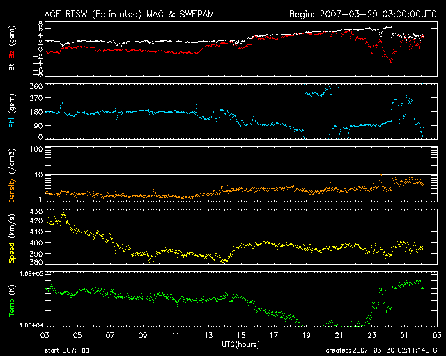 2007/ 3/30 11:12 更新 太陽風(390km/秒)、磁気圏ともに穏やかです。 担当 篠原 コロナホールが太陽の真ん中に、どっかりと座っています。 SOHO EIT284の写真(2枚目の黄色い写真)をご覧下さい。 ちょうど今、ここから地球に向かって速度の高い太陽風が吹き出しています。 その風が地球へやってくるのに3日ほどかかります。 これからやってくる高速風の予想を立てるため、 27日前にSTEREO衛星が撮影した写真と、現在のSOHOの写真を比較してみましょう。 今日1枚目の緑の写真は、27日前にSTEREO衛星が撮影した太陽です。 ここでも、太陽の中心付近にコロナホールが見えています。 この写真では、コロナホールは縦長に見えています。 一方、SOHOの写真ではコロナホールはやや横長に変わっています。 このため、継続期間が長くなったり、最高速度が高くなるなど、 高速風の様子が変化しているかもしれません。 しかし、大まかには前周期の変化が参考になるでしょう。 27日周期の図で、前周期の変化を見ます(図は世界時です)。 すると、3月5日から磁場強度が強まり、 速度の上昇は少し遅れて3月6日から始まっています。 この日付を今周期に当てはめると、明後日、4月1日に磁場に変化が発生して、 4月2日から速度が上昇を始めると予想されます。 ただし、速度の上昇は4月1日から始まるかもしれません。 コロナホールの位置的にはそのくらいが始まるタイミングに見えます。 実際にはどのような変化が見られるでしょうか。 現在の太陽風は、速度が390km/秒で平均的な状態です。 磁場強度が、2nTから6nTへゆっくりとした強まりを見せています。 グラフでは大きく見えますが、数値としては小規模の変化です。 グラフの最後の部分では4nTに落ちており、たいした乱れではありません。 磁気圏もとても穏やかで、AE指数にはほとんど変化が見られません。 今日から明日にかけては、このまま穏やかな状態が続くと予想されます。 明後日以降は、高速風の回帰が始まるでしょう。 放射線帯の高エネルギー電子のレベルは低く、穏やかです。 太陽面には949黒点群があります。 しかし、とても小さい群で、掲載の写真ではかろうじて見える程度です。 太陽のフレア活動も穏やかです。 STEREO衛星が27日前に撮影した、紫外線望遠鏡EUVI195の太陽写真。 (c) NASA ![]() SOHO衛星のEIT284カメラの映像 (c) SOHO (ESA & NASA)