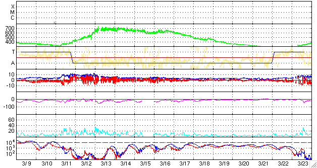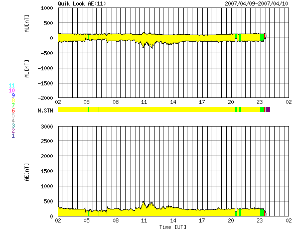 ACEが観測した太陽風の磁場(1番上の枠、白線は全体の強度、赤線は南北成分) および、太陽風の密度(3番目の橙線)、速度(4番目の黄線) (c) NOAA/SEC ![]() リアルタイムAE指数 下段のAEグラフの値が高くなると、オーロラ活動が活発化しています。 (c) 京都大学, NICT ![]() 27日の太陽周期に合わせたデータプロット 太陽が同じ面を地球に向けていた27日前の変化から、今後を予想することができます。 (c) NICT