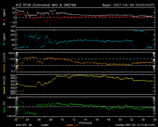 2007/ 4/10 10:40 更新 太陽風速度は、一旦500km/秒に上昇したものの、その後400km/秒に下がっています。高速風帯の様子が変化しています。 担当 篠原 このところ、太陽のX線強度がたいへん弱い状態が続いています。 フレア活動もたいへん少なく、 Cクラスの小規模フレアでも、2月19日以来、50日にわたって発生していません。 その様子を示すため、GOES12衛星が観測した太陽X線のグラフを作成しました。 2006年1月から今日までの、1年3ヶ月ほどのグラフです。 これを見ると、今年の2月以降X線の強度が弱まって、 観測器の下限付近に停滞している様子が分かります。 測定の下限に近づく事は、2006年中にも何度か見られていますが、 いずれも1ヶ月と続いておらず、 今回の低レベル状態はかなり長く続いているように見えます。 太陽活動は、今年が活動の極小になると予想されていますが、 極小の底の部分に達しつつあるということなのかもしれません。 さて、太陽風の変化ですが、予想と違って微妙な変化を示しています。 27日周期で前周期に見られたように、これから高速風がやって来ると予想していました。 しかし、昨日のニュースの後、速度は一旦500km/秒に上がったものの、 半日ほどで下がってしまい、 現在は400km/秒と通常の速度に戻ってしまっています。 また、速度の上昇前に10nTに強まっていた磁場強度も、 速度が上がったところで弱まってしまい、現在は2nTくらいしかありません。 27日周期の図で、上の段の前周期の太陽風速度(緑色線)の変化と、 下の段の今周期の変化とを比較してください。 たいへん大きく、様子が変わっています。 SOHO EIT284の太陽写真を見ると、コロナホールは太陽の西半分に進んでいます。 今後、再び速度が上がって、高速風になる可能性はありますので、 引き続き太陽風の変化に注目する必要はあります。 それでも、前周期ほどの高速風帯にはなりそうにありません。 昨日の磁気圏活動は比較的穏やかでした。 AE指数には、500nTの小さな変化が見られた程度です。 太陽風の速度変化が小幅だったことと共に、 太陽風磁場がやや北寄りに推移していたためです。 放射線帯高エネルギー電子は、1000くらいに下がっています。 警戒状態は終わりました。 今後の変化は、太陽風の様子を見る必要があります。 太陽は無黒点で、たいへん穏やかです。 2006年1月以降のGOES12衛星による太陽X線の強度変化。2007年2月以降たいへん弱まっています。 (c) 宇宙天気ニュース、NOAA ![]() SOHO衛星のEIT284カメラの映像 (c) SOHO (ESA & NASA)