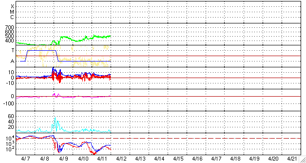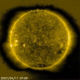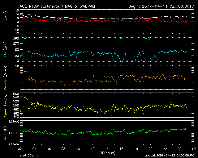 2007/ 4/12 10:01 更新 太陽風の速度がやや上がり(500km/秒)、高速風になっています。磁気圏は穏やかです。 担当 篠原 昨日のニュースの後、 11日11時(世界時11日2時)頃から太陽風の速度は500km/秒に上がり、 大きな速度ではありませんが、高速状態になっています。 その後、現在までこの速度で安定してます。 27日周期の図で前周期と比較すると、 高速風の様子が大きく変わってしまったのがよく分かります。 前周期の高速の期間と比較すると、すでに後半に入っています。 従って、速度はこれ以上大きく上がる事はないでしょう。 明日くらいまで高い状態が続く可能性がありますが、 その後は下がって、穏やかになるでしょう。 太陽風の速度は上がったものの、太陽風磁場は北寄りに推移しています。 そのため、磁気圏への影響は小さく、 AE指数にはほとんど変化が見られません。 磁気圏活動は穏やかです。 現在の磁場強度は、5nTと通常の強さです。 今後、南北成分が南に向くようになれば、 速度は高めになっていますので、小規模のオーロラ活動が期待できます。 放射線帯の高エネルギー電子は低いレベルで安定してます。 現在の太陽風の様子では、今回は目立った上昇は見られないでしょう。 太陽は無黒点の状態が続いています。 たいへん穏やかな太陽です。 SOHO衛星のEIT284カメラの映像 (c) SOHO (ESA & NASA)