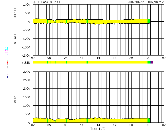 ACEが観測した太陽風の磁場(1番上の枠、白線は全体の強度、赤線は南北成分) および、太陽風の密度(3番目の橙線)、速度(4番目の黄線) (c) NOAA/SEC ![]() リアルタイムAE指数 下段のAEグラフの値が高くなると、オーロラ活動が活発化しています。 (c) 京都大学, NICT ![]() 27日の太陽周期に合わせたデータプロット 太陽が同じ面を地球に向けていた27日前の変化から、今後を予想することができます。 (c) NICT