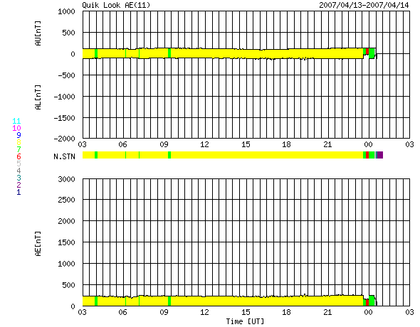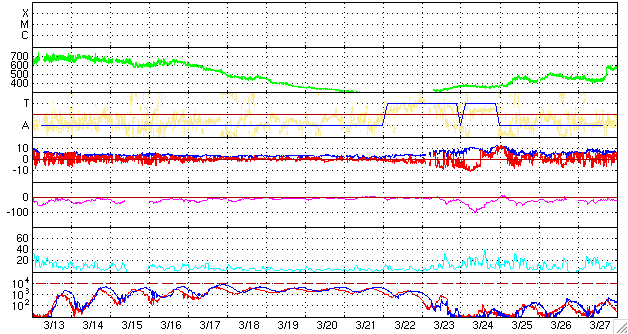 ACEが観測した太陽風の磁場(1番上の枠、白線は全体の強度、赤線は南北成分) および、太陽風の密度(3番目の橙線)、速度(4番目の黄線) (c) NOAA/SEC ![]() リアルタイムAE指数 下段のAEグラフの値が高くなると、オーロラ活動が活発化しています。 (c) 京都大学, NICT ![]() 27日の太陽周期に合わせたデータプロット 太陽が同じ面を地球に向けていた27日前の変化から、今後を予想することができます。 (c) NICT