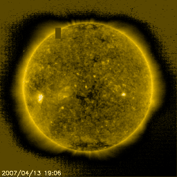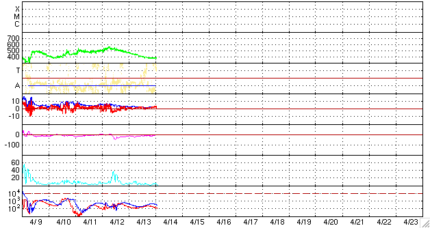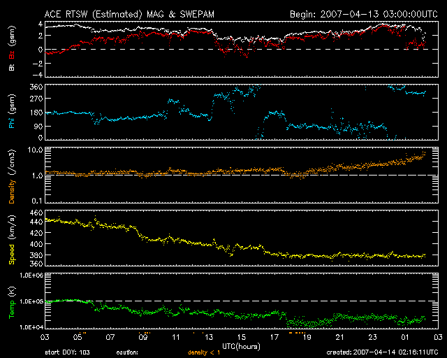 2007/ 4/14 11:17 更新 太陽風の速度は下がり(380km/秒)、磁気圏はたいへん穏やかです。太陽は無黒点が続いています。 担当 篠原 太陽風の速度(ACEの黄色線)は380km/秒に下がり、通常の速度に戻っています。 磁場強度(白線)も3nTとやや弱く、太陽風は穏やかになっています。 太陽風磁場の南北成分(赤線)は、主に北寄り(プラス)の状態が続いています。 そのため、地球の磁気圏へのエネルギーの流れ込みは小さく、 オーロラ活動は穏やかです。 AE指数のグラフには全く変化が見られません。 27日周期の図を検討すると、 この穏やかな状態は、これから5日間くらい続くと予想されます。 SOHO EIT284の太陽写真をみると、太陽は全体的に薄ぼんやりと光っていて、 はっきりしたコロナホールは見られません。 ただ、太陽の中心にかすかに暗い部分が見られ、 小規模のコロナホールができているかもしれません。 そのため、明後日の16日頃に、太陽風に多少の乱れが発生するかもしれません。 ただし、大きな乱れにはならないでしょう。 太陽は、4月5日以来10日間にわたって無黒点が続いています。 SpaceWeather.comによると、 もう1日続けば、1996年以来の長期間の無黒点になるそうです。 太陽活動の極小期の底の時期に達しているということでしょう。 フレア活動もたいへん穏やかです。 放射線帯高エネルギー電子は低いレベルで安定しています。 SOHO衛星のEIT284カメラの映像 (c) SOHO (ESA & NASA)