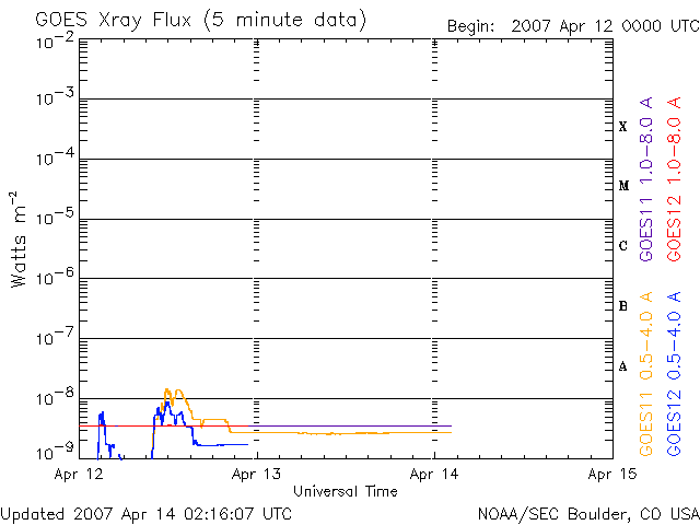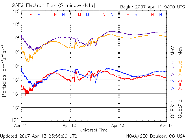 (c) SOHO (ESA & NASA) ![]() GOES衛星の太陽X線データ (c) NOAA/SEC ![]() GOES衛星による、静止衛星軌道における高エネルギー電子の変化 (c) NOAA/SEC ![]() | ||||||||||||||||||||||||||||||||||||||||||||||||||||||||||||