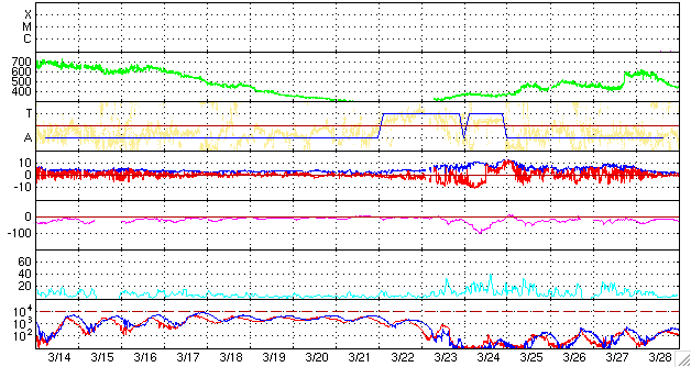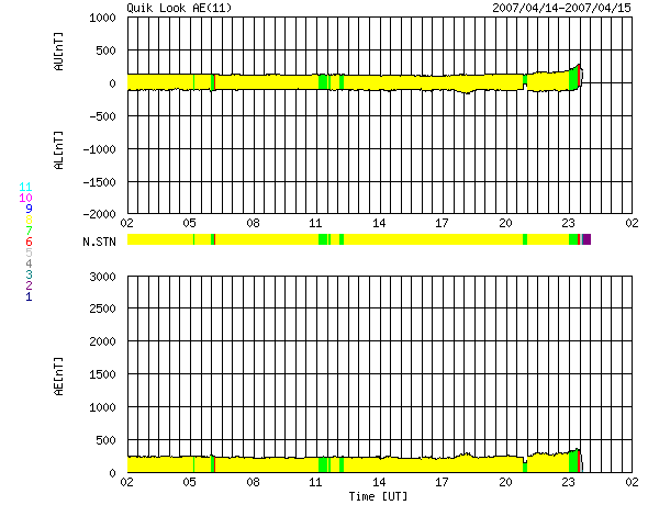 ACEが観測した太陽風の磁場(1番上の枠、白線は全体の強度、赤線は南北成分) および、太陽風の密度(3番目の橙線)、速度(4番目の黄線) (c) NOAA/SEC ![]() リアルタイムAE指数 下段のAEグラフの値が高くなると、オーロラ活動が活発化しています。 (c) 京都大学, NICT ![]() 27日の太陽周期に合わせたデータプロット 太陽が同じ面を地球に向けていた27日前の変化から、今後を予想することができます。 (c) NICT