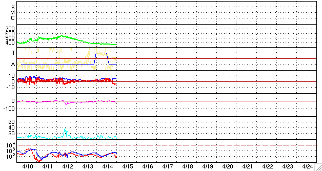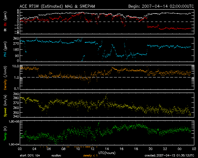 2007/ 4/15 10:36 更新 太陽風は低速です(360km/秒)。磁場が安定して-4nTの南向きになっています。 担当 篠原 太陽風の速度は360km/秒に下がり、低速状態です。 磁場強度も5nTと普通の強さですが、 図の後半、15日4時半(世界時14日19時半)から南北成分が大きく南を向いています。 -4nTのほぼ安定した南向きが、現在まで6時間にわたって続いています。 南向きが続いているため、 太陽風から地球磁気圏へエネルギーが流れ込みやすい状態になっています。 しかし、速度が遅いので、小規模の変動が起こる程度でしょう。 AE指数のグラフでは、あまりはっきりした変化は見えていません。 この南向きがどこまで続くのか、興味深いところです。 太陽風としては、今後も低速で穏やかな状態が続くと思われます。 磁気圏のオーロラ活動も、基本的には穏やかに推移すると思われます。 太陽は無黒点のままです。 X線のグラフは、下限いっぱいに落ちていて、 フレア活動は非常に穏やかです。 (SOHO EIT284の写真は、掲載していますが前日と同じものです) SOHO衛星のEIT284カメラの映像 (c) SOHO (ESA & NASA)
