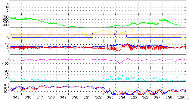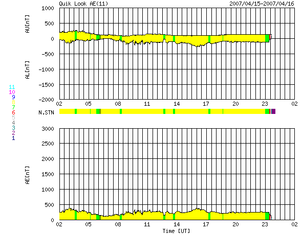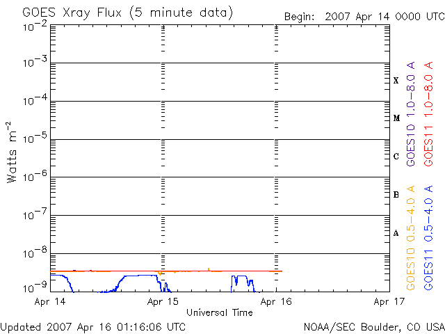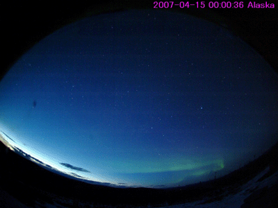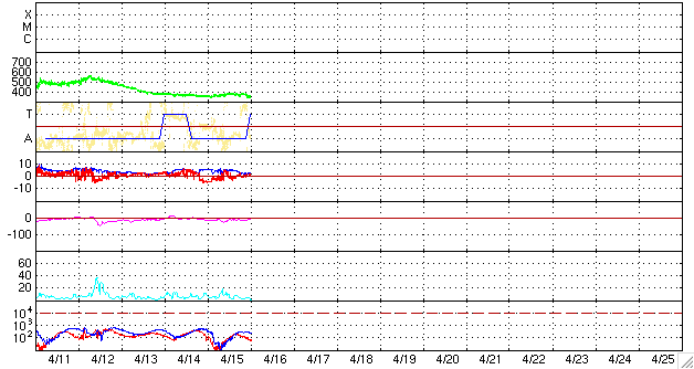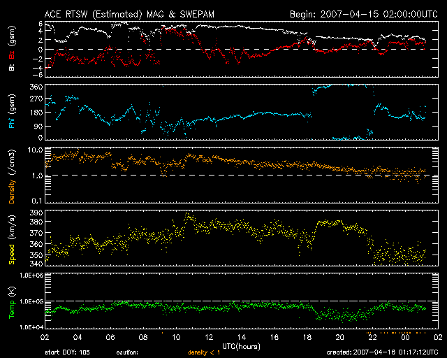 2007/ 4/16 10:17 更新 太陽風はやや低速(350〜380km/秒)で、磁気圏も概ね静穏です。 担当 篠原 昨日、太陽面にたいへん小さな黒点群、951群が発生したそうです。 ただし、掲載している可視光の太陽写真では、 今日の写真でも、昨日の写真でも見つけることはできません。 SOHO EIT284の写真で、太陽の中心からやや東(左)に寄ったところに見える、 小さな明るい領域で発生したようです。 この黒点群について、SpaceWeather.comに記事が載っていました(4月16日号)。 この小さな黒点群は、発生してわずか2時間ほどで消えてしまったとのことです。 昨日まで、太陽は無黒点の状態が約11日間にわたって続いていました。 しかし、951群のために連続記録は一旦途絶え、 今日から新しく無黒点の日が始まったとしています。 やや低速の太陽風が続いています。 太陽風の速度は、350〜380km/秒の間をゆっくりと変化していて、 ほとんど安定しています。 磁場強度は5nTから2nTへ弱まっています。 太陽風磁場の南北成分は、-2nTくらいの弱い南向きが度々見られています。 低速のため、目立った活動は起きていませんが、 AE指数をよく見ると、小さな規模のオーロラ活動が見られていたようです。 すっかり夜の時間が短くなってしまったアラスカのライブカメラですが、 短時間の夜の期間にきれいなオーロラの乱舞が見られています。 今後の予想ですが、SOHO EIT284の太陽写真を見ると、 太陽の東側に、南北に斜めにのびるコロナホールが見えて来ています。 まだ、斜め方向から見ているため、暗さがはっきりしませんが、 もう2日ほどすると、よりはっきりと姿が見えて来るでしょう。 このコロナホールの影響は、4月21日ころからやってくると思われます。 27日周期の図で、3月25日以降に見られている太陽風の乱れの回帰です。 アラスカライブカメラによる、15日17時(現地15日0時、世界時15日8時)のオーロラの様子。 (c) NICT/SALMON ![]() SOHO衛星EIT284による、15日16時(世界時15日7時)の太陽。 (c) ESA & NASA ![]() SOHO衛星のMDIカメラによる太陽黒点 (c) SOHO (ESA & NASA) ![]() GOES衛星の太陽X線データ (c) NOAA/SEC ![]() ACEが観測した太陽風の磁場(1番上の枠、白線は全体の強度、赤線は南北成分) および、太陽風の密度(3番目の橙線)、速度(4番目の黄線) (c) NOAA/SEC ![]() リアルタイムAE指数 下段のAEグラフの値が高くなると、オーロラ活動が活発化しています。 (c) 京都大学, NICT ![]() 27日の太陽周期に合わせたデータプロット 太陽が同じ面を地球に向けていた27日前の変化から、今後を予想することができます。 (c) NICT