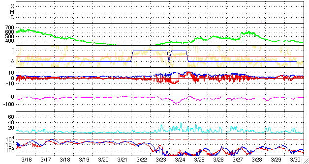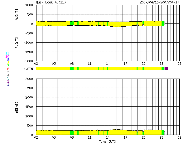 ACEが観測した太陽風の磁場(1番上の枠、白線は全体の強度、赤線は南北成分) および、太陽風の密度(3番目の橙線)、速度(4番目の黄線) (c) NOAA/SEC ![]() リアルタイムAE指数 下段のAEグラフの値が高くなると、オーロラ活動が活発化しています。 (c) 京都大学, NICT ![]() 27日の太陽周期に合わせたデータプロット 太陽が同じ面を地球に向けていた27日前の変化から、今後を予想することができます。 (c) NICT