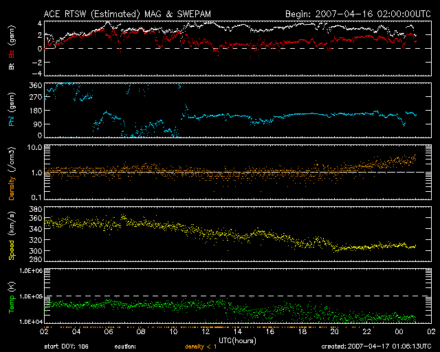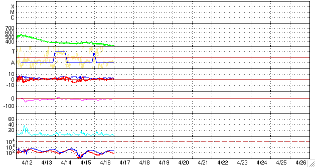 2007/ 4/17 10:07 更新 太陽風は低速(300km/秒)で、磁気圏も穏やかです。太陽は無黒点のままです。 担当 篠原 穏やかな宇宙天気が続いています。 太陽風の速度(ACEの黄色線)は360km/秒から300km/秒へ下がり、かなり低速になっています。 磁場強度(白線)は2〜4nTとやや弱まった状態です。 南北成分(赤線)は、ほぼ北向き(プラス方向)で推移しています。 低速、弱磁場、北向きと3つ重なっていますので、地球の磁気圏もたいへん静かです。 極域のオーロラ活動を示すAE指数のグラフには、全く変化が見られていません。 この静かな状態は、今日を含めて4日ほど続くと思われます。 次の太陽風の乱れは、21日ころからと予想されます。 SOHO EIT284の太陽コロナの写真をご覧下さい。 今日は2枚掲載しています。 左が最新の写真、右が27日前の写真です。 どちらの写真にも、太陽の中心やや左寄りに、斜めに黒い領域が見えています。 ここは、コロナホールと呼ばれる領域です。 太陽の持つ磁場が、宇宙空間へ向かって広がりだしている領域で、 その磁場の広がりに乗って、太陽のプラズマが勢い良く飛び出しています。 高速の太陽風の発生源です。 もう1日ほどすると、コロナホールの先頭(右端)は太陽の中心に達します。 すると、地球へ向かって高速の太陽風が飛び出す様になります。 飛び出したプラズマの風は、3日後くらいに地球にやってきます。 この計算から、次の高速風は4日後、 4月21日くらいにやって来るだろうと予想しているのです。 2枚の写真を比較すると、コロナホールの位置はほとんど変化していません。 従って、太陽風の周期性という観点でも、大きな変化は見られないでしょう。 27日周期の図を見ると、前回の高速風は3月25日くらいから始まっています。 その27日後は、確かに4月21日です。 ここでひとつ興味があるのは、 前周期の3月23-24日に、太陽風磁場の大きな乱れがやってきたことです。 -10nTの大きな南向きがやって来て、小規模の磁気嵐を起こしました。 ただ、この時は速度に大きな変化は見られませんでした。 この乱れが今回も回帰してくるのか、たまたま3月に発生しただけなのか、 明後日の19日には、この変化にも注目してください。 放射線帯の高エネルギー電子は低いレベルで安定してます。 太陽は無黒点のままです。 X線のグラフは、見事にと言いたくなるほど、べったりと下に張り付いています。 ほんとうに穏やかな太陽です。 SOHO衛星のEIT284カメラの映像 (c) SOHO (ESA & NASA)