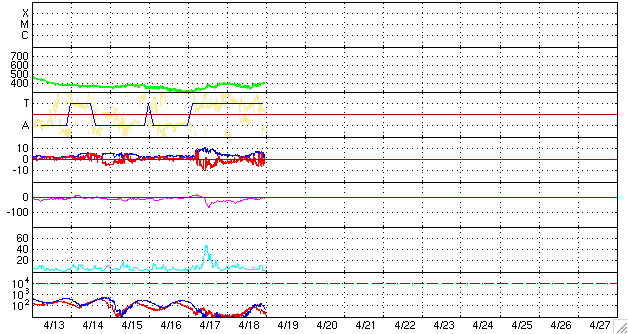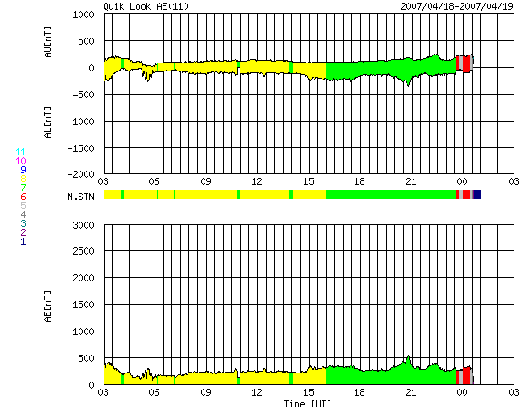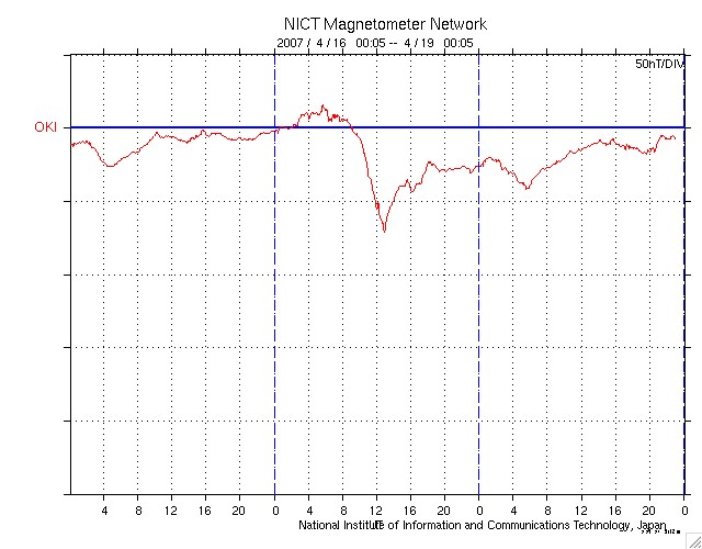 ACEが観測した太陽風の磁場(1番上の枠、白線は全体の強度、赤線は南北成分) および、太陽風の密度(3番目の橙線)、速度(4番目の黄線) (c) NOAA/SEC ![]() リアルタイムAE指数 下段のAEグラフの値が高くなると、オーロラ活動が活発化しています。 (c) 京都大学, NICT ![]() 沖縄の磁場擾乱 下へ下がるほど、擾乱が発達している事を意味します。 (c) NICT ![]() 27日の太陽周期に合わせたデータプロット 太陽が同じ面を地球に向けていた27日前の変化から、今後を予想することができます。 (c) NICT
