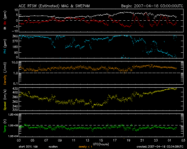 2007/ 4/19 11:05 更新 太陽風磁場の乱れは終わり、穏やかな宇宙天気に戻っています。 担当 篠原 太陽風磁場の連続的な南向きは終わり、 宇宙天気は穏やかな状態に戻っています。 ACE衛星の観測によると、太陽風の速度は400km/秒前後で普通の速度です。 磁場強度は5nTでこちらも通常の強度です。 南北成分は、一昨日の南向きの名残りがあるのか、 比較的南寄りに推移しているように見えます。 それでも、南向きが長時間続くということはなく、 短時間で南と北の間を変化しています。 このためでしょうか、 AE指数では、ところどころに小さな変化が見られている程度で、 磁気圏はだいぶ穏やかな印象です。 沖縄の磁場データを見ると、17日に発生した小規模の磁気嵐から、 ゆっくりと磁場強度が回復している様子が分かります。 既に、静穏レベルの青線にほぼ戻っています。 宇宙空間で、地球を取り巻いて流れる環電流が、 太陽風の乱れによって急激に形成され、 その後ゆっくりと消失している過程を見ているのです。 さて、次はいよいよ高速太陽風の到来です。 SOHO EIT284の太陽コロナ写真では、 中心部にどっかりとコロナホールの穴が空いています。 コロナホールの右端は、太陽の西側(右側)に進み出していて、 もう少し進むと、地球へ影響が及び始める目安の位置になります。 この写真の様子では、 20日の終わりから21日に入る頃に高速風がやってくるのではないでしょうか。 ただ、27日周期の図で前周期の太陽風の変化を見ると、 高速風の前、3月23日ころから磁場の乱れが続いています。 これに対応する変化が、17-18日に見られた磁場の乱れかもしれませんが、 高速風の到来まで太陽風の変化がどうなるか、興味あるところです。 太陽に現れた952黒点群は、早くも西に没しつつあります。 SOHO EIT284の写真で、右端に明るく光っている点が黒点の位置です。 掲載している可視光の写真では、見つける事ができませんでした。 この後、無黒点の日が再び始まりそうです。 SOHO衛星のEIT284カメラの映像 (c) SOHO (ESA & NASA)