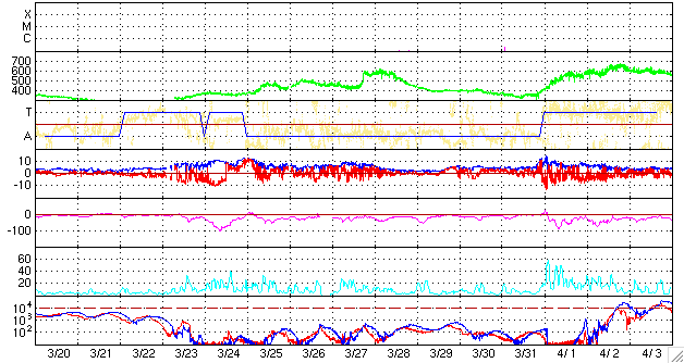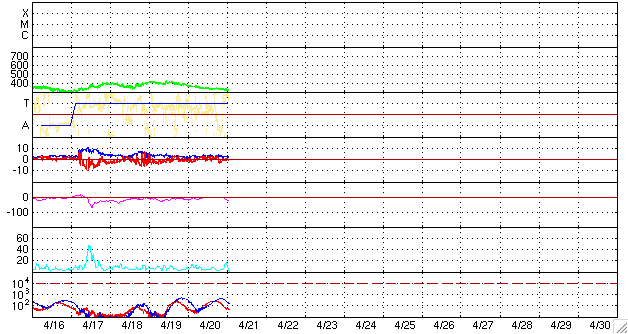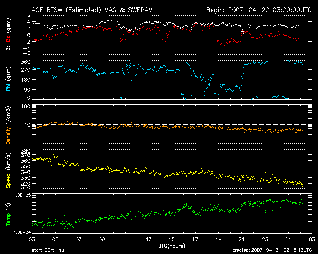 2007/ 4/21 11:16 更新 太陽風は低速で(320km/秒)、高速風はまだ始まっていません。太陽は無黒点が続いています。 担当 篠原 太陽風に変化はまだ始まっていません。 太陽風の速度は昨日より更に下がり続けて、 現在は320km/秒とかなり低速の状態になっています。 磁場強度も3nT前後に弱まったままです。 もうしばらく、高速風はやって来そうにありません。 27日周期の図で、前周期の変化と比較します。 前周期も、あまり強い高速風領域にはならなかったのですが、 3月25日以降は、速度の高まりが発生しました。 これは今周期では、今日、4月21日に相当します。 一方、太陽風磁場の変化を見ると、 前周期の3月25日には、強度の強まりは既に始まっていました。 この点で、今回はやや出遅れています。 SOHO EIT284の太陽写真では、コロナホールは地球への影響域へ進んでいます。 立派なコロナホールに見えるのですが、 今回も前周期の様な規模の高速風となるのでしょうか。 引き続き、太陽風に注目してください。 穏やかな太陽風が続いていますので、地球の磁気圏は静穏です。 AE指数には全く変化が見られません。 太陽は無黒点のままです。 SOHO EIT284の太陽を見ても、明るく光る活動的な領域は見られません。 X線のグラフも最低レベルが続いています。 穏やかな太陽が続いています。 SOHO衛星のEIT284カメラの映像 (c) SOHO (ESA & NASA)