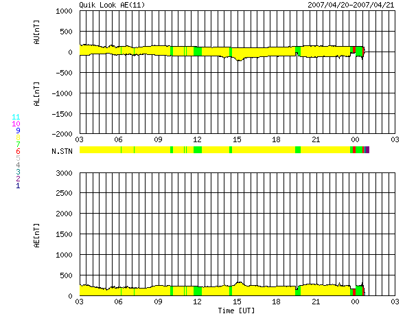 ACEが観測した太陽風の磁場(1番上の枠、白線は全体の強度、赤線は南北成分) および、太陽風の密度(3番目の橙線)、速度(4番目の黄線) (c) NOAA/SEC ![]() リアルタイムAE指数 下段のAEグラフの値が高くなると、オーロラ活動が活発化しています。 (c) 京都大学, NICT ![]() 27日の太陽周期に合わせたデータプロット 太陽が同じ面を地球に向けていた27日前の変化から、今後を予想することができます。 (c) NICT
